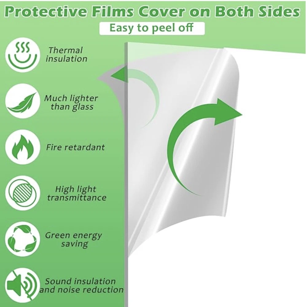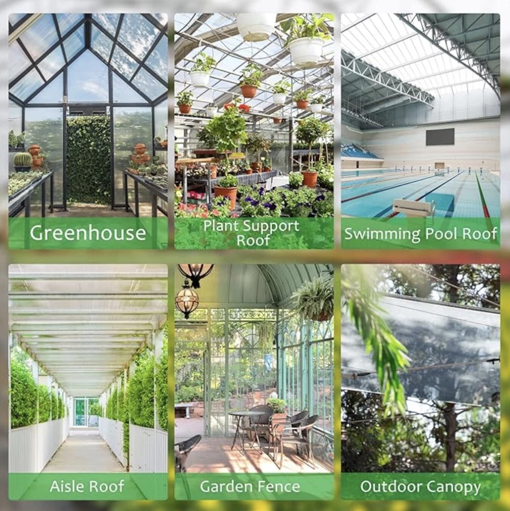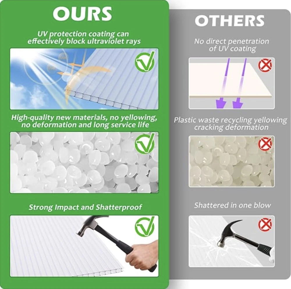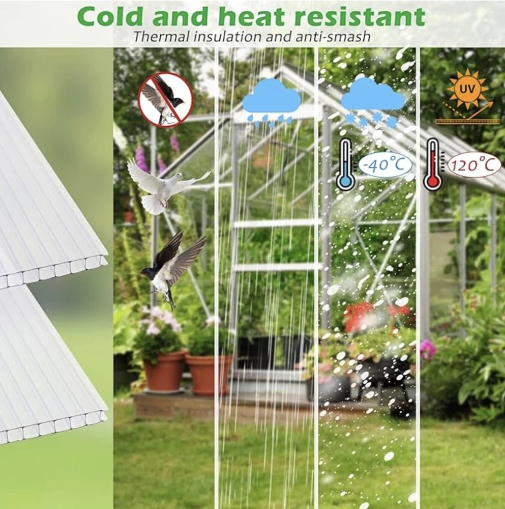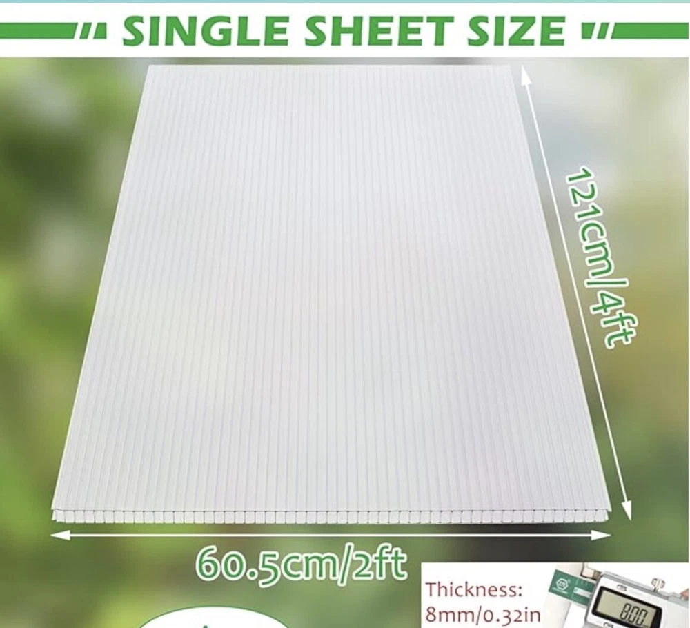🌿【Premium Polycarbonate Panels】 Polycarbonate greenhouse panels is made from virtually unbreakable 8 mm twin-wall polycarbonate, The greenhouse panels allow up to 89% light transmission for optimal plant growth while blocking out over 99.5% of harmful UV rays. Each panels has nice impact strength, durable and lightweight, not easy to break or deform, twin-wall polycarbonate is also sufficiently flexible to allow moderate curves. 🌿【Protecting Plants greenhouse roof panels create the ideal environment for your plants to thrive in the greenhouse, The twin-wall structure reduces heating costs in winter while minimizing excessive heat in summer. Its working temperature ranges from 125 to -40 Celsius 🌿【Easy to Cut Polycarbonate panel can be cut to the desired size, just use a utility knife, please be careful when cutting!You can also cut polycarbonate sheets with a circular saw, jig saw, hand saw or utility knife. It will not crack or splinter. This product is shipped with a thin protective film on both sides, to protect the products from being scratched on the delivery, ensure the completeness of the polycarbonate panels for you. Please peel off the outer white protective film before use 🌿【Wide Range of Applications There are 14 pieces of twin wall polycarbonate panels, each size is about 2'(W) X 4'(L)X0.32"; Enough quantity and proper size can meet your different needs. Polycarbonate greenhouse panels commonly is used for build plant greenhouses. It can also be used for a multitude of applications such as balcony canopy, aisle roof, garden fences, swimming pool roof, carports, fish tank lids etc. 🌿【10 Year Limited Warranty Thoroughly tried and tested, we're confident you'll love your polycarbonate greenhouse panels. If you're not happy with it for any reason, contact us and we'll make it right.