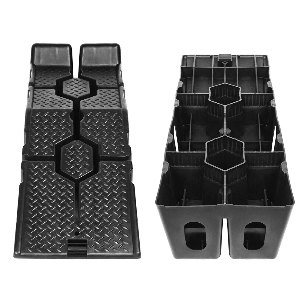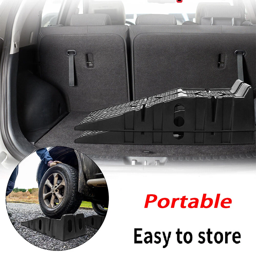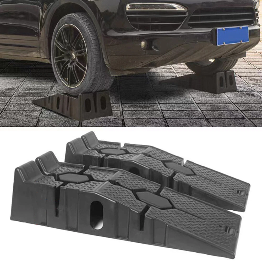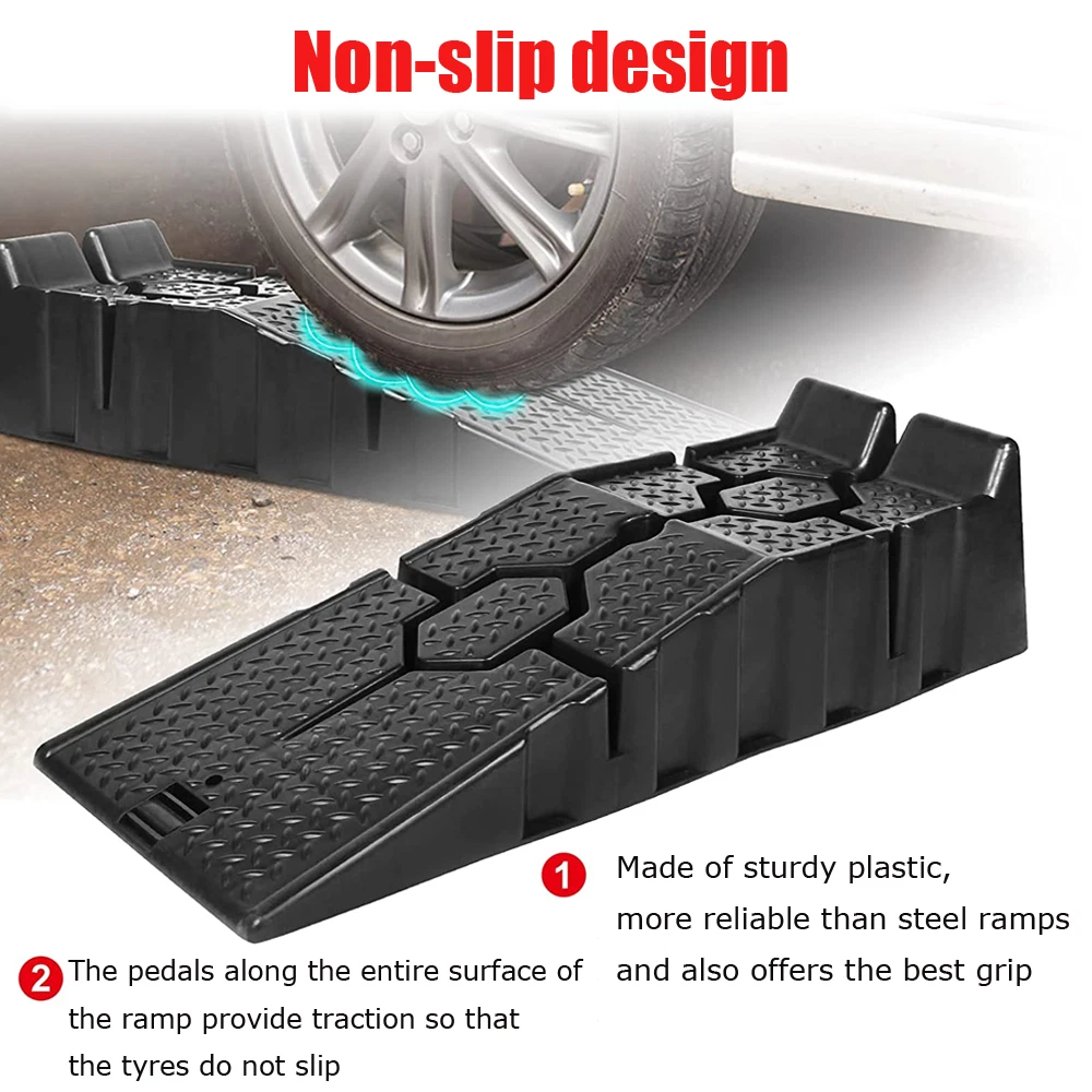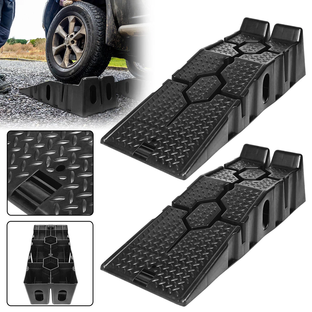 Descriptions -Make small servicing tasks on your vehicle extremely easy with this pair of heavy duty car ramps . Made from high grade and impact resistant plastic for reliable and long-lasting performance, this pair ensures you’ll have enough room to lie underneath your car comfortably. -An interlocking design ensures safe use and easy storage, meaning they can be kept in your car, garage and house when not needed. -The surface of both plastic ramps features a non-slip texture that increases friction between tires and ramps for added safety. -With a set of plastic ramps, the daily maintenance of the car can be easier, no need to go to the 4S workshop or garage to change the oil. -They carry up to 2500 kg of weight so that large vehicles can be driven safely It is perfect for multiple scenes and environments, no need to worry about the weather -Regardless of whether it is a car, caravan or camper, the resilient ramps are suitable for various vehicle models and even lowered vehicles are no problem for these ramps. -A wide range of uses: suitable for curbs, square steps, driveways, garage steps, loading docks, parking lots and so on. Specifications: Color: Black Material: PP Load capacity: 2500 kg per pair Total dimensions: 90*33*22cm Package included 1Pair x Car Lifting Ramp
