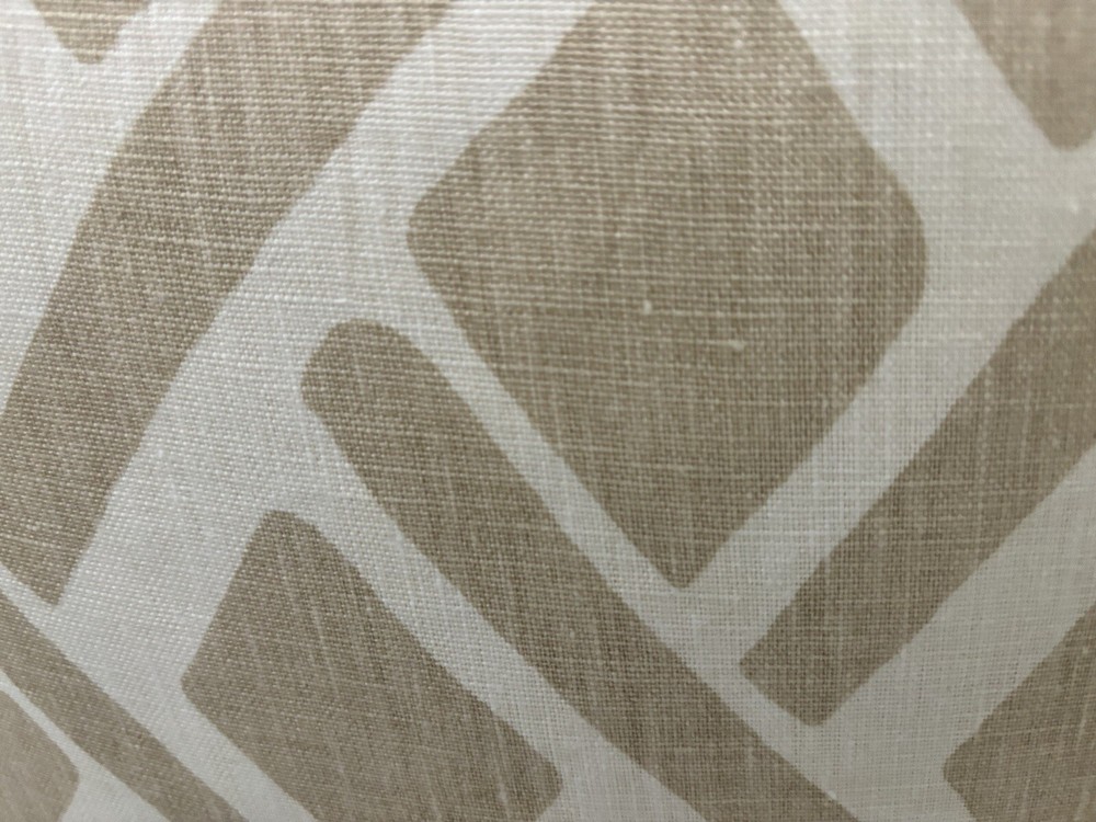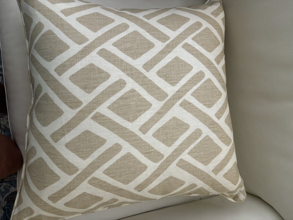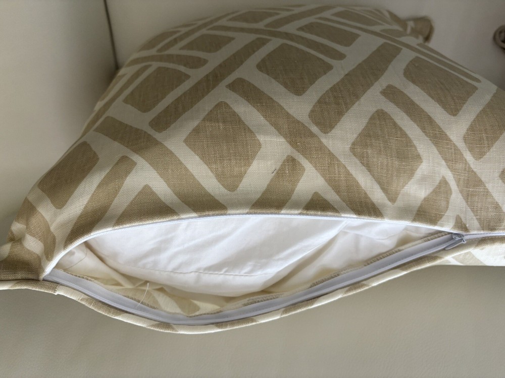 Exclusively custom made by me ( designer). This designer custom pillow cover by Thibault linen Geometric pattern in a square shape with a contemporary style. The cover is made 100% Linen material in beige and white colors, measuring 21x21 inches. It is double-sided and includes a zip closure for easy removal. This stylish pillow cover is suitable for various rooms in the home, such as the bedroom, living room, or dining room, adding a touch of abstract art to your decor. Made by me in my workroom- self welting, invisible zippers, serged to stop fraying Double sided- just beautiful Available: 3 PAIRS available- SIZE - 21x21 Had wash or machine Inserts not included Price is for one (1) PAIR ( maybe sold individually if you contact me)