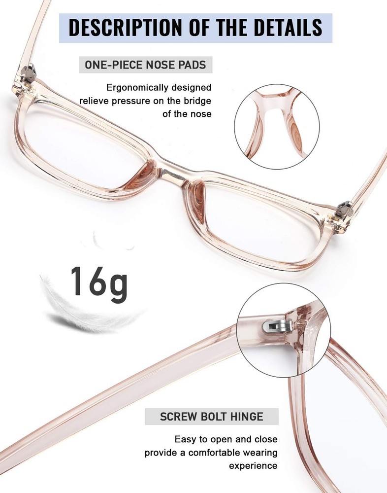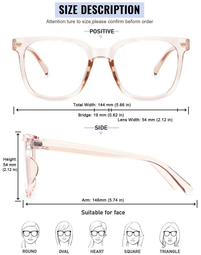 111 ✔️ 【OVERSIZED SQUARE DESIGN】: Stylish oversized frame design, ideal for almost every kind of face, comfortable daily wear and popular among men and women. The frames fits any look whether casual, high-fashion or classically elegant. ✔️ 【BLUE LIGHT FILTER & REPLACEABLE LENS】:Reduce symptoms of eyestrain during prolonged computer exposure. These frames are best used as indoor lenses for long hours of computer use to maintain natural sleep patterns and eye protection. The original lenses can be replaced with your prescription lenses at any store. ✔️ 【MATERIAL】: Using high quality TR90 materials,more light weight and flexible. It can effectively prevent the damage to the eyes and face caused by the fracture and friction of the eyeglasses frame in the movement. ✔️ 【GREAT FOR COMPUTER WORK】: Anyone who works hours a day at digital screens like computer, phones and is struggling to fall asleep at night, then you need a blue light filter glasses. ✔️ 【OUR SERVICE】:We stick to pay attention to product quality, if there's any quality problems please feel free to contact us.