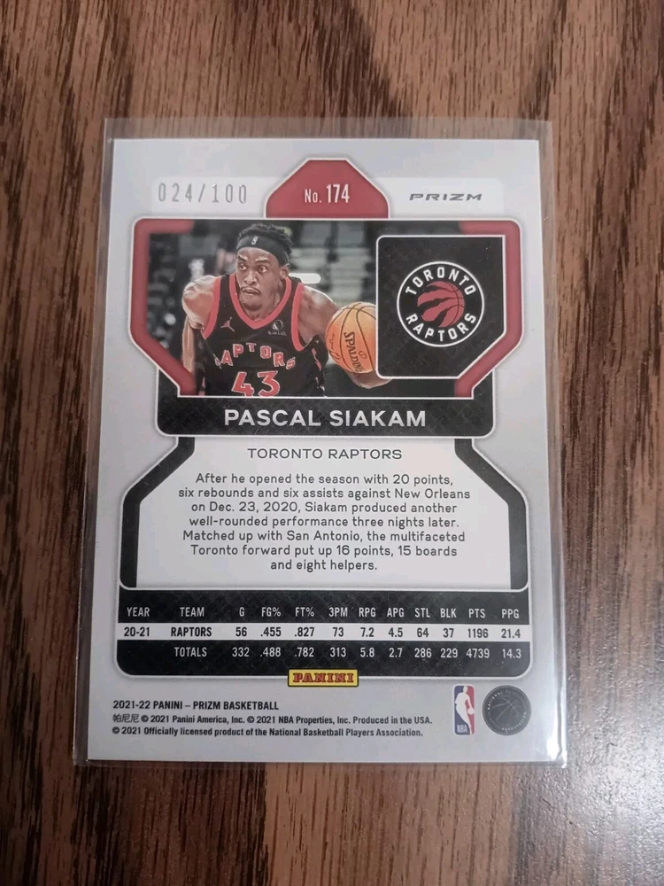 This is a rare and highly sought-after sports trading card featuring Pascal Siakam from the Toronto Raptors. The 2021-22 Panini Prizm Fast Break 174 card is a red disco parallel/variety, making it a unique addition to any collection. This card is serial numbered and part of a limited edition of only 100 copies, making it an extremely valuable item for any fan or collector. It is from the National Basketball Association (NBA) league and manufactured by Panini. The card showcases Siakam's talent and is a must-have for any fan of the sport.