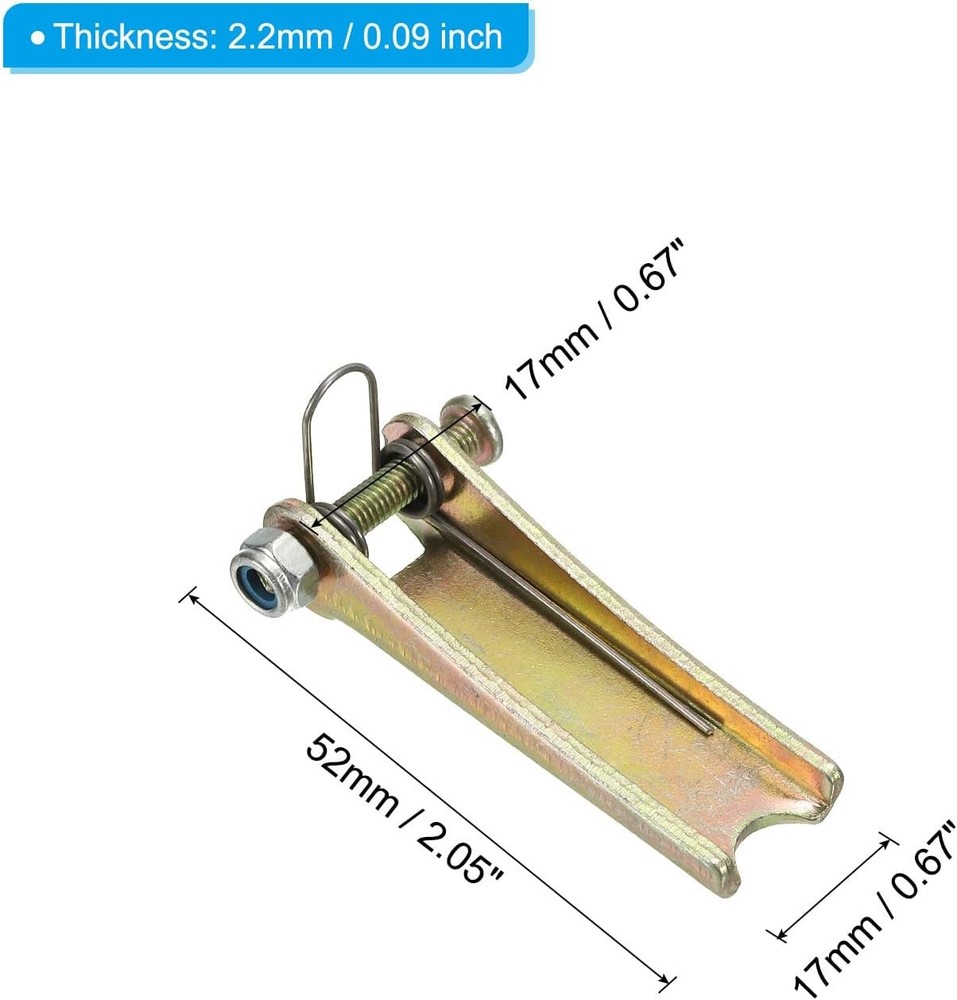 PATIKIL 2 Inch Hook Safety Latch Kit, 4 Pack Metal Towing Hitch Replacement for Clevis Hook Trailer, Golden Tone Product Details Brand: PATIKIL Item Weight: 0.08 Kilograms Vehicle Service Type: Van, RV, Car, Truck Material: Metal Finish Type: Powder Coated Manufacturer: PATIKIL Item Weight: 2.82 ounces Package Dimensions: 3.66 x 2.48 x 0.67 inches Country of Origin: China Item model number: Modern Manufacturer Part Number: pta230720tt000129 Brand: PATIKIL Item Weight: 0.08 Kilograms Vehicle Service Type: Van, RV, Car, Truck Material: Metal Finish Type: Powder Coated Overall Length: 52mm / 2.05 inch; Outer Width: 17 x 17mm / 0.67 x 0.67 inch (Top*Bottom); Package List: 4 x Hook Safety Latch Kit Advantages: Sturdy metal material, fine workmanship, rust-resistant, handy and durable. Spring-loaded designed latch for quick release. Applications: This safety latch is fit for hitches, trailer wiring, cargo management, and more. It is for secure attachment and quick release as needed. Instruction: Easy to use. Replace the latch on clevis hook in daily applications NOTE: Before placing the order, please confirm the size This safety latch is fit for hitches, trailer wiring, cargo management, and more. It is for secure attachment and quick release as needed.SpecificationColor: GoldenMaterial: MetalThickness: 2.2mm / 0.09 inchOverall Length: 52mm / 2.05 inchOuter Width: 17 x 17mm / 0.67 x 0.67 inch (Top*Bottom)Package List: 4 x Hook Safety Latch KitAdvantagesSturdy metal material, fine workmanship, rust-resistant, handy and durable. Spring-loaded designed latch for quick release.InstructionEasy to use. Replace the latch on clevis hook in daily applications.NoticeBefore placing the order, please confirm the size.