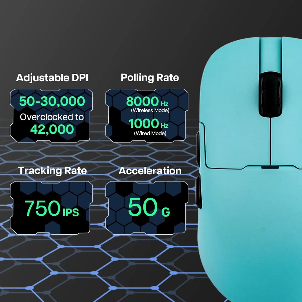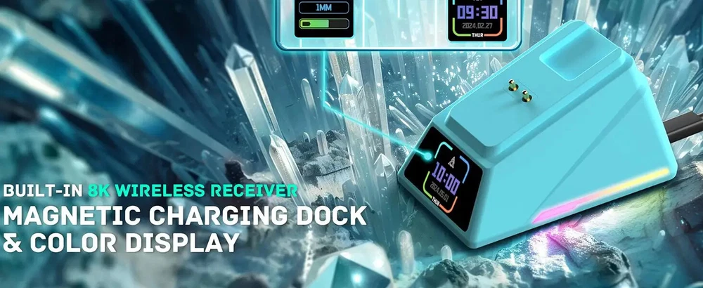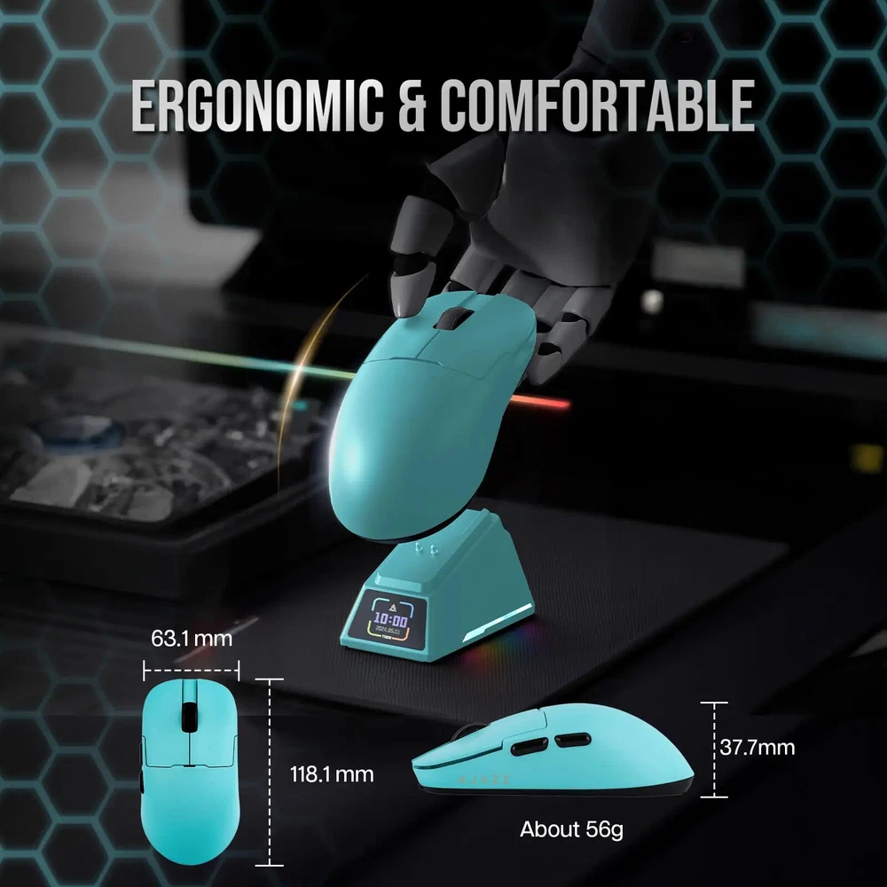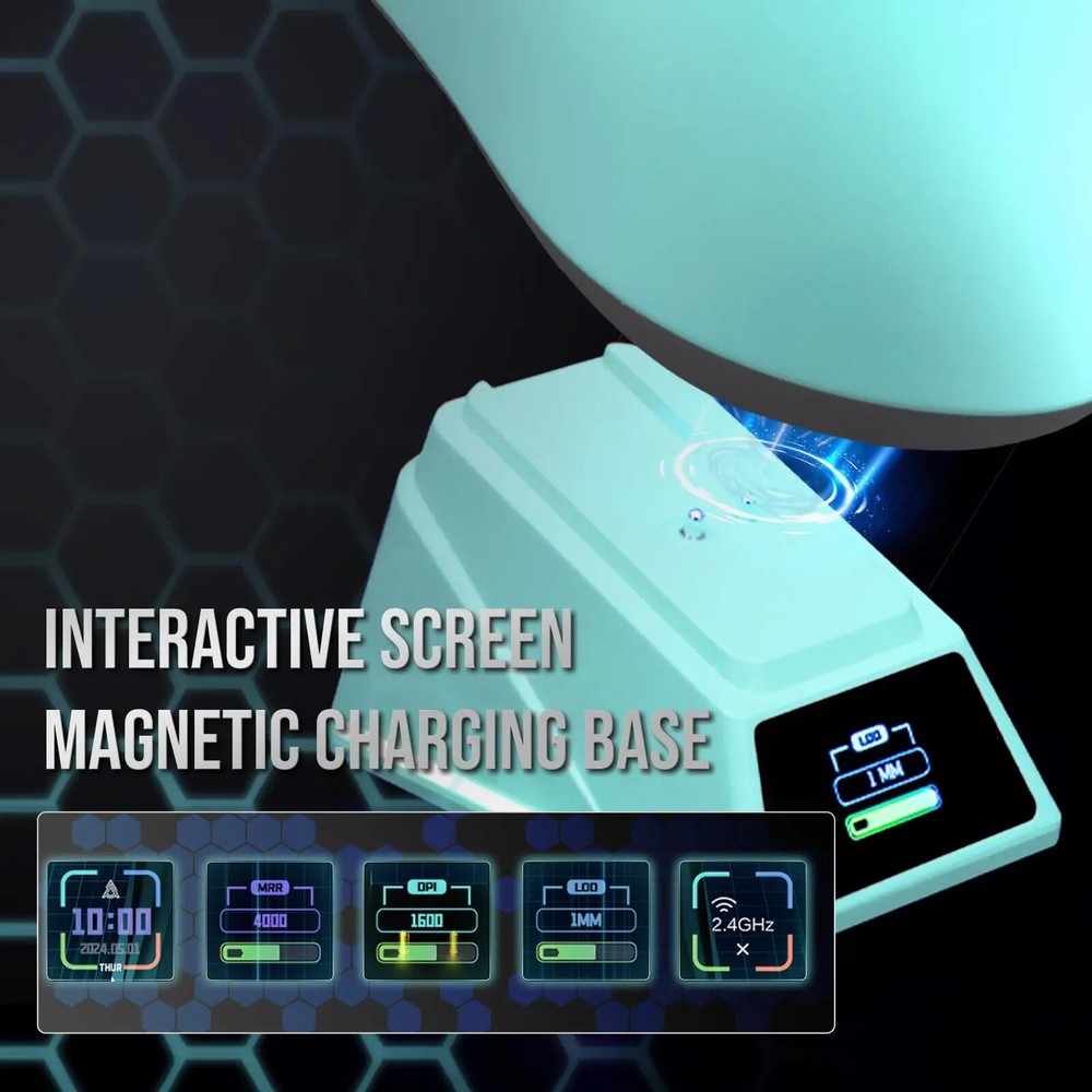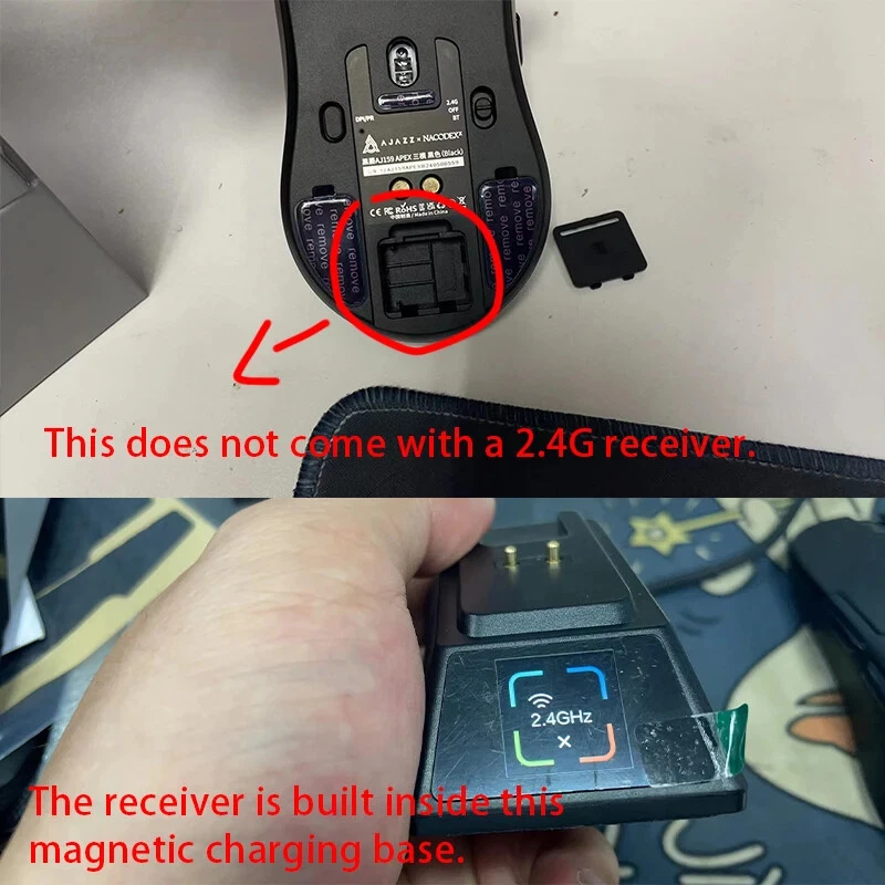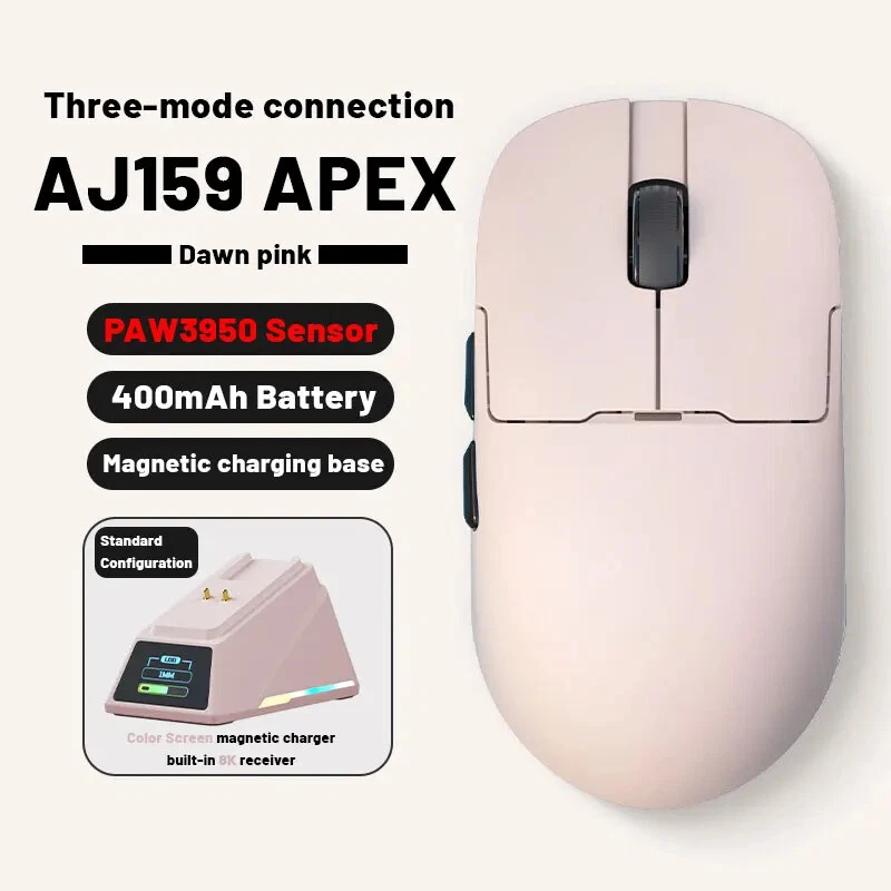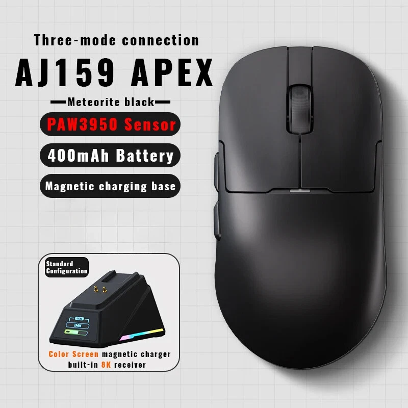 Notice before Purchase Dear customers, recently, I have seen that some friends raised the issue that the AJ159APEX does not come with a 2.4G USB receiver at the bottom. Here, I would like to make a statement: The AJ159APEX has abandoned the traditional USB interface receiver and integrated the 8K receiver inside the magnetic charging base . Therefore, the position that was originally supposed to be equipped with a USB receiver at the back is empty , which is a normal situation. How to connect to 2.4G? First, insert the USB interface of the power cord into the USB 3.0 interface of the computer, and then connect the Type-C interface to the Type-C interface of the magnetic charging base. When the RGB light of the base is on, it indicates that the connection is successful. The second step is to turn the mouse over, turn on the 2.4G switch (push the switch to 2.4G), and then you will see that the 2.4G connection symbol on the display screen of the magnetic charging base changes from "X" to "O" , which indicates that the connection is complete and you can start using it. AJAZZ AJ159 APEX Wireless Mouse PAW3950 Sensor 2.4G/BT/USB-C Optical Gaming Mouse 56g Lightweight With 8K Magnetic Charging Base Product Introduction: Model:AJ159 APEX Color:Black/White/Orange/Blue Three -Mode:2.4g Wireless + Wired + Bluetooth Weight:About 56g Size:118.1*63.1*37.7mm (suitable for small and medium-sized hands) Sensor:PAW3950,APEX-Ajazz Customization DPI:30K,Overclocking Can Reach 42K Response Rate:Wired 1K+Wireless 8K Receiver:Standard the color screen magnetic suction built -in 8k receiver+support Gif moving map, time display, and tuning display. Battery:400mAh Product Feature: · 【Fast 8Khz PAW3950 Sensor】 AJ159 APEX is equipped with AJAZZ's custom flagship PAW3950 APEX optical sensor, which achieves unparalleled accuracy and sensitivity through 30K DPI (overclocking can reach 42K DPI), 750 IPS and 50G. The 8000HZ polling rate allows you to experience real-time accuracy in wireless mode, with up to 8000 data reports per second, achieving minimal latency and excellent gaming performance. (Wired 1K and Wireless 8K) · 【Magnetic Colorful Screen Charging Dock】 The professional optical mouse is paired with an innovative RGB magnetic screen charging dock. The unique colorful screen allows you to more quickly query the mouse's connection mode, DPI, LOD, custom GIF patterns, etc. The magnetic charging base gives you true charging freedom and is equipped with adjustable RGB lighting to make the desktop colorful and add a cool atmosphere. · 【56G Ultra-Lightweight Comfortable Design】 8K gaming mouse shell adopts comfortable ice-feel coating process, which is very friendly for you who like marathon game players and sweaty palms. At the same time, it adopts a carefully designed grip structure, the Bluetooth mouse weighs only 56±3g, the structure is durable, and it moves faster and more accurately. · 【Tri-mode Connection Programmable Mouse】 Custom gaming mouse supports Bluetooth for easy connection, supports ultra-high-speed 2.4Ghz wireless for lag-free gaming, supports wired USB-C, and charges during use. You can use powerful software to assign macros, remap button functions, redefine DPI, LOD, adjust polling rate and charging base personalized pattern, monitor battery status, etc. Install the driver by official website to download or web link: QMK.TOP · 【Over 100 Million Click & ETFE Foot Pad】 Lightning-fast precision with Huanuo green-translucent white dot micro switch configuration, crisp and clear click feeling enhances game control, each button over 100million click test; in order to enhance wear resistance and stability, the bottom uses pure Teflon foot pads to ensure faster movement and better control in intense games. · 【Fashion Personality Color】 In order to satisfy you, which a personality and professional gamer, AJAZZ has launched 4 bright colors of mouse to provide you with diverse choices; AJ159 APEX mouse has a 12-month warranty. If you encounter any problems, we will provide you with service within 24 hours, even on weekends! Parcel list: Mouse x 1 User manual x 1 Set of PTFE Feet x 1 Flexible Paracord Cable x 1 Magnetic charging base x 1