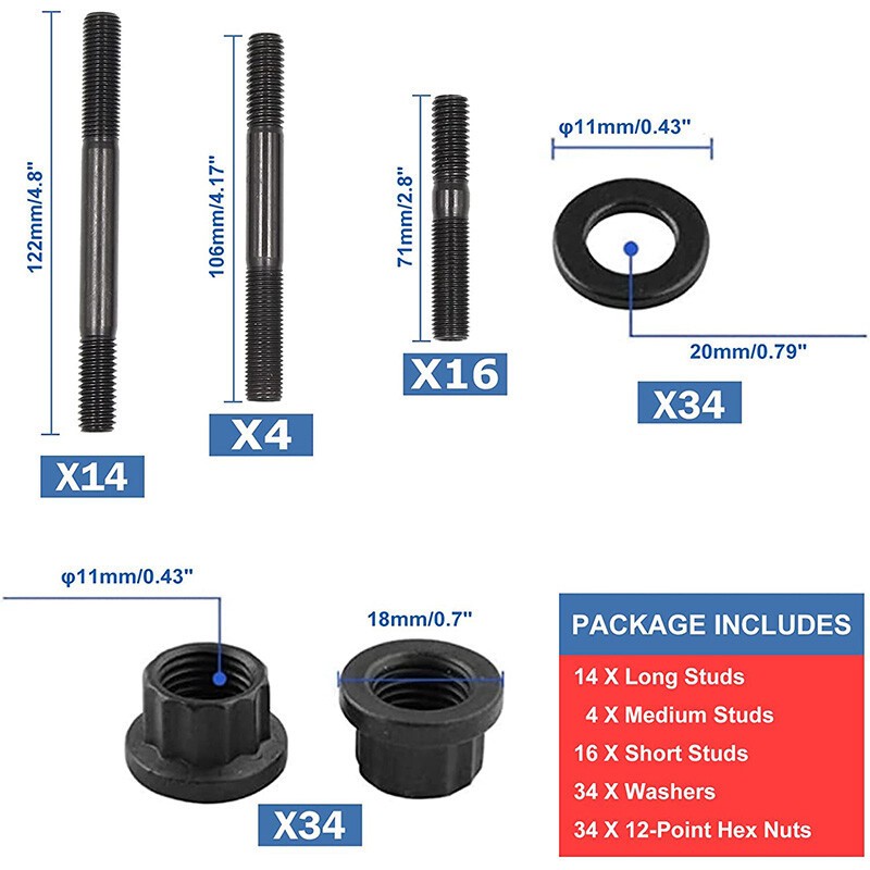 PCE279.1001 Cylinder Head Stud Kit For Small Block Chevy SBC 265 267 283 302 350 Item Description SBC Cylinder Head Stud Kit. OEM Part Number: PCE279.1001, 134-4001, 2451-S High Quality: Build to strict quality control standards, Great strength and durability. Easy to Use: Firm fastening and easy operation, High quality and great Fitment. Fitment: Replacement for Chevy Small Block SBC 265 267 283 302 305 307 327 350 383 400 Head Studs Package Includes: 14 x Long studs, 4 x Medium length, 16 x Short studs, 34 x screws, 34 x pads Features 1.Each cylinder head screw set is strictly manufactured to ensure zero defects-hardened and parallel ground washers are included with zero failures to ensure uniform load distribution and accurate torque readings. 2.The bolts are cold forged to ensure molecular integrity and heat treated before thread rolling and machining. 3.Product installation involves the engine, the internal structure of the engine is complex, Professional Installation is Highly Recommended. Specifications Condition:100% Brand New Warranty: 90 Day Free Return:30 Day Color:Black Fitment Chevy Small Block SBC 265 267 283 302 305 307 327 350 383 400 Head Studs Please Double-Check that this is compatible with your vehicle. Package Included 14 x Long studs 4 x Medium length 16 x Short studs 34 x screws 34 x pads As pictures show FAQ: I purchased by mistake, how do I cancel the order? Please contact us ASAP. If the item has not been shipped out we can cancel the order for you. If the item was shipped out you can refuse the package and wait for the item to return to us. I received your item but it does not fit or is defective Please contact us so we can assist you on the matter. Buy with confidence Our quality is based on meeting the requirements of the manufacturer and improvement them in design problems manufacture. NOTE: (1)It would be highly appreciated if you might contact us first once you have any problems concerning the items. And you can expect all the issues would be resolved ASAP! (2)Please let us know before you send us the neutral/negative feedback that wont help to finish the issues. And I will definitely try my best to provide the best solutions which would meet our satisfactory! (3)According to the distance of the receipt address items would be sent from CA or NJ