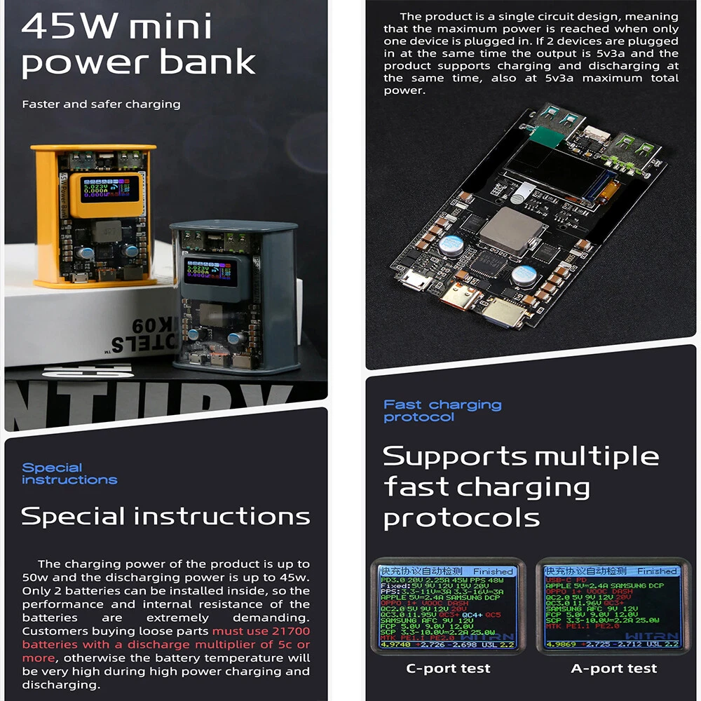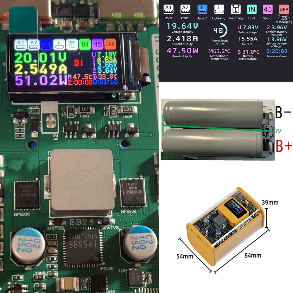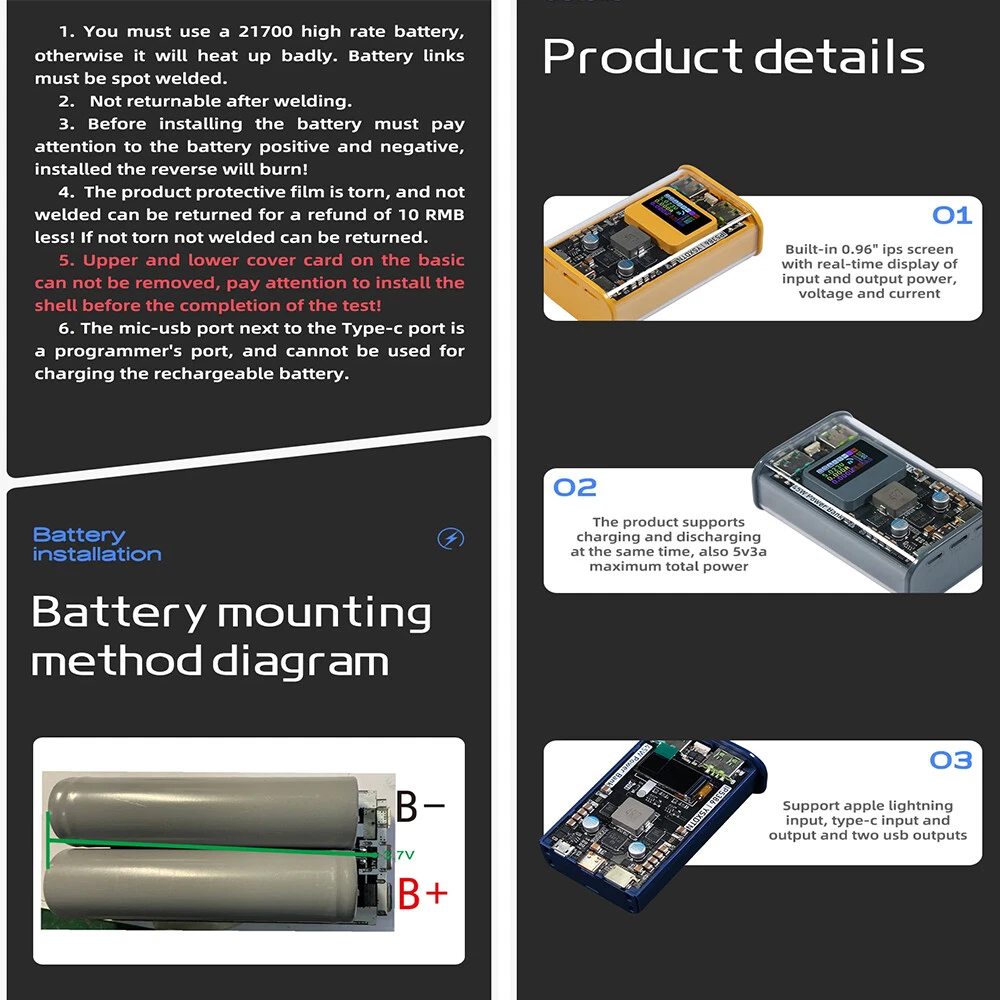 Hot Sale 12V 3S 7P 40A BMS Li-ion Battery Pack DIY Kits Case Holder Fr 18650 Power Wall// 11.99 USD 1.99 USD 12V 3S 7P 40A Li-ion Battery Pack DIY Kits Case Holder for 18650 Power Wall ACUS 6.99 USD 2.99 USD 12V 3S 7P 40A BMS Li-ion Battery Pack DIY Kits Case Holder Fr 18650 Power Wall 6.99 USD 2.99 USD 48V 13S Power Wall 18650 Li-ion Battery Module Battery Box Holder BMS PCB Board. 17.44 USD Free shipping 24V Power Wall 6S Battery BMS PCB Board Battery Holder Box Module 40A DIY ACUS 11.92 USD 12.96 USD 0.99 USD 8% off 3S 40A BMS 12V 3S7P Battery Bracket Protected Board for 18650 Lithium Battery * 8.27 USD 8.99 USD Free shipping 8% off Daly BMS 3S-16S 12V-60V 15A-60A Li-ion LiFePo4 BMS Common Port w/Balance+NTC lot 12.42 USD 13.5 USD Free shipping 8% off 12V 3S 7P Li-ion Battery Storage Case Box with Power Display/ 3S40A BMS/Holder 12.59 USD 13.69 USD Free shipping 8% off 24V 21700 DIY Power Wall Battery Box Case 6S 40A BMS Battery Pack Ebike Battery 10.55 USD 11.47 USD Free shipping 8% off Daly BMS 3S-14S 15A-60A Li-ion LiFePo4 Battery Protection Board with Balance USA 16.47 USD Free shipping Daly BMS 3S-16S Li-ion LiFePo4 5A Active Balancer Battery Equalizer Board Newest 19.78 USD 21.5 USD Free shipping 8% off Daly Smart BMS WIFI Bluetooth Module for Lifepo4 Li-ion Battery Accessories USA 19.23 USD Free shipping Product Description New Arrival 100Pcs Nickel Strip For Li Battery Packs Spot Welding Machine Welder ACUS USA 11.59 USD Free shipping Daly KMS/Regular Smart BMS WIFI Bluetooth Module for Lifepo4 Li-ion Battery ACUS 21.07 USD Free shipping 8S-24S 150A Li-ion LiFePo4 BMS Board 2A Active Balancer APP BT/RS485 LCD-2.0 USA 149.87 USD Free shipping For 18650 Battery Pack DIY Welding Free Battery Charging Case Type-C Power Box 10.68 USD Free shipping 8S 5A Battery Balance Li-ion LiFePO4 Battery Active Equalizer Balancer Board US 27.9 USD Free shipping JK Smart 200A 4S-8S 12V 24V LifePo4 Li-ion LTO Start BMS 2A Active Balancer LOT 19.23 USD 20.9 USD Free shipping 8% off Daly New KMS/ Regular Smart BMS WIFI Bluetooth Module for Lifepo4 Li-ion Battery 13.7 USD Free shipping Daly KMS Smart BMS WIFI Bluetooth Module for Lifepo4 Li-ion Battery Accessories 21.07 USD Free shipping Daly Smart BMS 3S-16S 12V-60V 40A-100A Li-ion LiFePo4 Battery BMS Bluetooth USA 42.9 USD Free shipping Insulation Epoxy Plate for 3.2V 320Ah 310Ah 280Ah 90Ah 12.8V Lifepo4 Battery USA 22.99 USD Free shipping JK 4S-8S 100A-300A SMART BMS Li-ion LiFePo4 Active Balancer BMS BT/RS485 Lot USA 10.95 USD Free shipping JK 8S-24S 60A-200A Smart BMS LiFePo4 Li-ion Active Balance Board BT Lot ACUS USA 10.07 USD Free shipping Features: 1. The finished product adopts high-quality two 21700 batteries, with Samsung 50e batteries and a total capacity of 10000mah. 2. The product has a power of up to PD45W and is bidirectional, making it suitable for short-term use when going out. 3.0.96 inch IPS high-definition intelligent color screen, with beautiful screen UI design, including power, voltage, current, interfaces, and more. 4. Small and beautiful, portable, with large power, intelligent screen display, high-quality battery cells, and a variety of colors to choose from. You can carry it with you when you go out, weighing only 205g, which is very convenient. Specification: Product colour: grey yellow bluetooth Product size: 84*54*39mm Product power: 45W(MAX) Battery type: 21700 Battery Quantity: 2PCS Battery discharge rate:≥5C Screen display:Our mobile power supply has a built-in 0.96 memory IPS screen, which can display real-time input and output power, voltage, and current in the lower left corner. Each interface can also display real-time load conditions, and there will also be a display when the device is plugged in. It can display information such as the voltage of each battery, total voltage, current, temperature, percentage of battery charge, etc. For those who like to view monitor data, it is very suitable. The screen display UI design is beautiful, the data is comprehensive, and the logo is also comprehensive. At a low price, it can enhance the visual and experiential experience. Port:The product has a total of 4 interfaces, all data cables can be used. Apple Lightning input. Type-c input output. Use two outputs.Two USB output. NOTE: 1.The product has a maximum charging power of 50w and a maximum discharge power of 45w. Only 2 batteries can be installed internally, so there are extremely high requirements for battery performance and internal resistance. Customers who purchase spare parts must use 21700 batteries with a discharge rate of 5c or above, otherwise the battery temperature will be very high during high-power charging and discharging. 2.The product assembly is simple, with 2 sections of 21700 being welded in series. Finally, connect the wires on the battery pack to the motherboard. Attention should be paid to spot welding between batteries in order to generate excessive current, otherwise the contact points will generate heat and cause high temperatures in the battery. Package Includes: 1*1set PD45W Power Bank You may also like JK BMS LCD Display/ RS485 Converter/ BMS Power Switch/ 4.3inch LCD Display Lot 10.95 USD Free shipping 12V 30Ah Battery Case Box LiFePO4 Li-ion DIY for Solar System Energy Storage 18.42 USD 20.02 USD Free shipping 8% off Daly BMS 3S-16S Li-ion LiFePo4 5A Active Balancer Battery Equalizer Board Newest 19.78 USD 21.5 USD Free shipping 8% off 12V YT5 Motorcycle Starter Battery Plastic Shell Case fr 18650/32650/26650 Pack/ 11.72 USD 12.74 USD Free shipping 8% off 12V 12Ah 55Ah 70Ah Battery Case for LiFePO4 32700 18650 Empty Storage Box ACUS 11.03 USD 11.99 USD Free shipping 8% off LCD Display RS485 Converter Adapter Power Switch Transfer Board for JK BMS LOT 6.59 USD 7.16 USD Free shipping 8% off Daly Smart BMS 3S-16S 12V-60V 40A-100A Li-ion LiFePo4 Battery BMS Bluetooth ACUS 30.27 USD 32.9 USD Free shipping 8% off JK Smart BMS 8S-20S 200A Li-ion LiFePo4 BMS with 2A Active Balance BT/RS485 Lot 