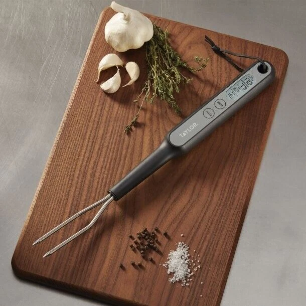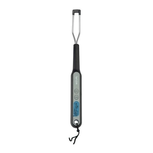 Taylor Precision Products Digital Preset Fork Thermometer The Taylor Precision Products' Digital Preset Fork Thermometer is ideal for backyard grilling! It features 5 doneness levels and 6 different protein types as settings to take the guessing out of grilling. Once the target temperature is reached, the alarm will signal. The display is bright blue so it can be seen easily in all environments. With 5 doneness levels and 6 different proteins (beef, chicken, pork, veal, lamb, turkey), this thermometer takes the guesswork out of grilling 2-in-1 turner and thermometer saves storage space Use convenient lanyard to hang the thermometer on grill hooks Blue backlit screen is easy to read, even in the bright outdoor sun Power switch thelps conserve battery life; thermometer operates on 2 AAA batteries (included) Temperature range: -14°F to 230°F (5°C to 110°C) Important: thermometer will be hot after use; use potholders or oven mitts when handling hot thermometer Listing and template services provided by inkFrog