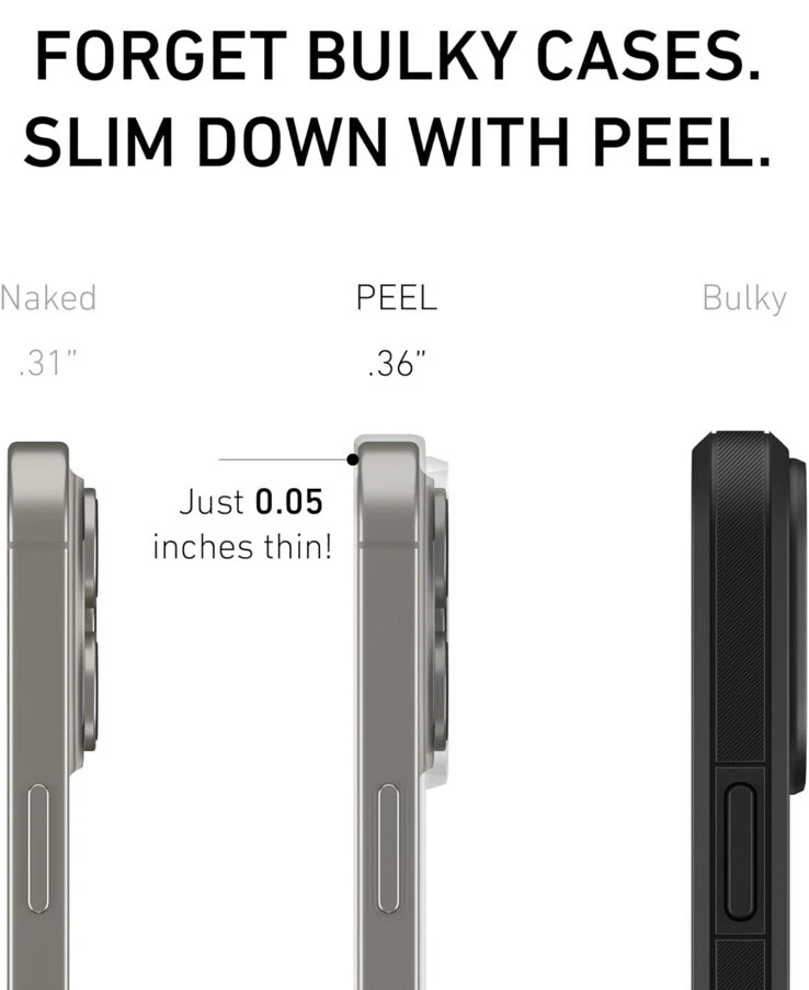 Brand PEEL Compatible Phone Models iPhone 15 Pro Max Color Clear Soft - i15 Pro Max Compatible Devices iPhone 15 Pro Max Material Thermoplastic Polyurethane Pattern Solid THE FLEX CASE: Inspired by The Original Super Thin case, the Flex case measures just 0.05 inches thin. It enhances your phone's aesthetics while providing durability, flexibility, and an added layer of protection, all while maintaining a thin profile. BRANDING FREE, MINIMALIST DESIGN: Features a sleek and minimalist appearance, free from any PEEL logos or branding, for a clean aesthetic. Crafted from soft yet durable TPU, it provides superior pocket-friendliness compared to silicone, which tends to attract dust and lint and lacks the durability and slimness of TPU. ENHANCED EVERYDAY PROTECTION: Keep your phone safe and looking brand new. Designed to prevent scratches, dents, and protect against minor drops, it features a raised lip to shield your camera lens from unnecessary damage. Plus, enjoy enhanced grip for a comfortable hold, thanks to its softer and more flexible material.
