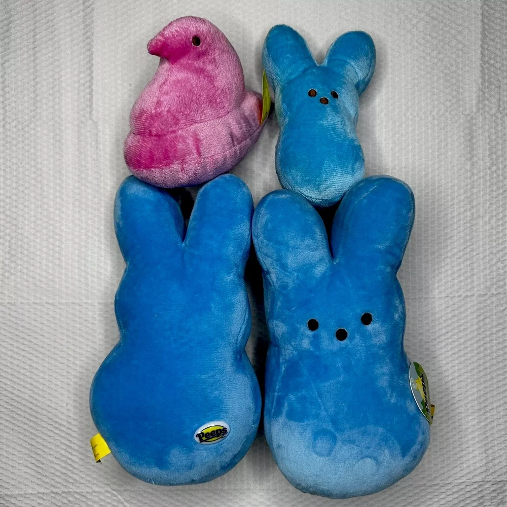 PEEPS Original Plush Figurines Three Blue Easter Bunnies and Pink Chick Lot Of 4 Two Big Blue 9” Rabbit Plush One Small Blue 5” Rabbit Plush One Small Pink 6” Chick Plush One of the big blue 9” rabbits still has its tags on it. All item are pre-owned, open box, but like new. See photos… Pre-Owned in Good Condition (Like New) Polyester Fiber No Rips No Tears No Stains No Smoke Smells No Pet Hairs Please Ask Any Questions Before Purchase… This lot of four original Peep plush figurines includes three blue Easter bunnies and a pink chick. The stuffed toys are all retired and washable, making them perfect for children ages 3 and up. Two of the bunnies are 6 inches tall and the other two are 9 inches tall, providing a range of sizes for little hands to hold and play with. The Peeps brand is known for its high-quality stuffed animals, and this set is no exception. These toys are perfect for Easter celebrations or any time that a child wants to add a cute and cuddly friend to their collection. Don't miss out on the chance to bring home these adorable plush figurines! Thank You for your interest in this item… “B”
