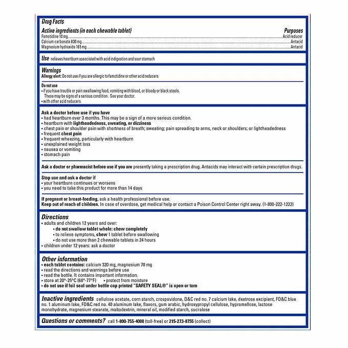 Dual Action Pepcid Complete Acid Reducer + Antacid, 100 Chewable Tablets Famotidine 10 mg. Calcium Carbonate 800 mg. Magnesium Hydroxide 165 mg. Prevents and Relieves Heartburn Berry Flavor