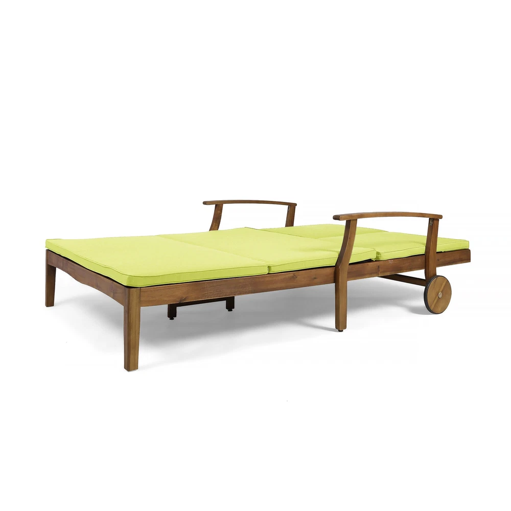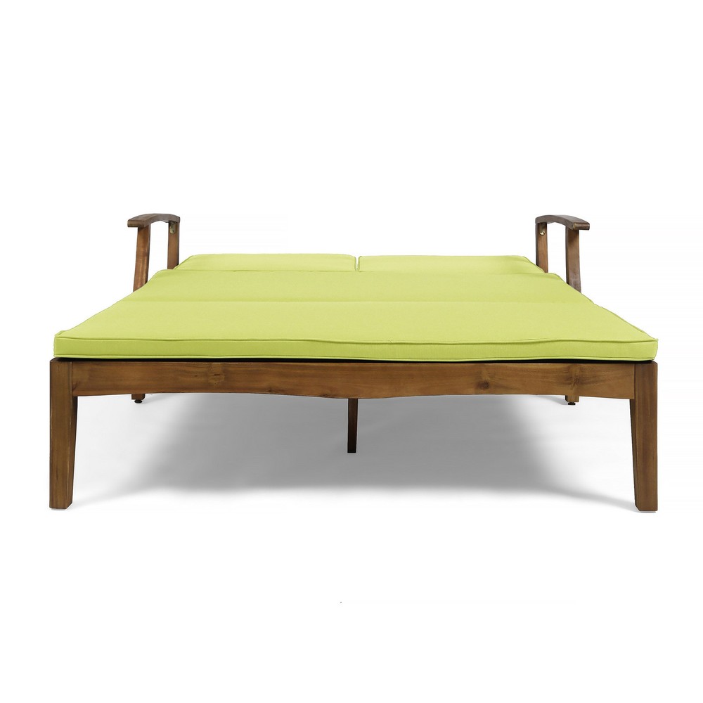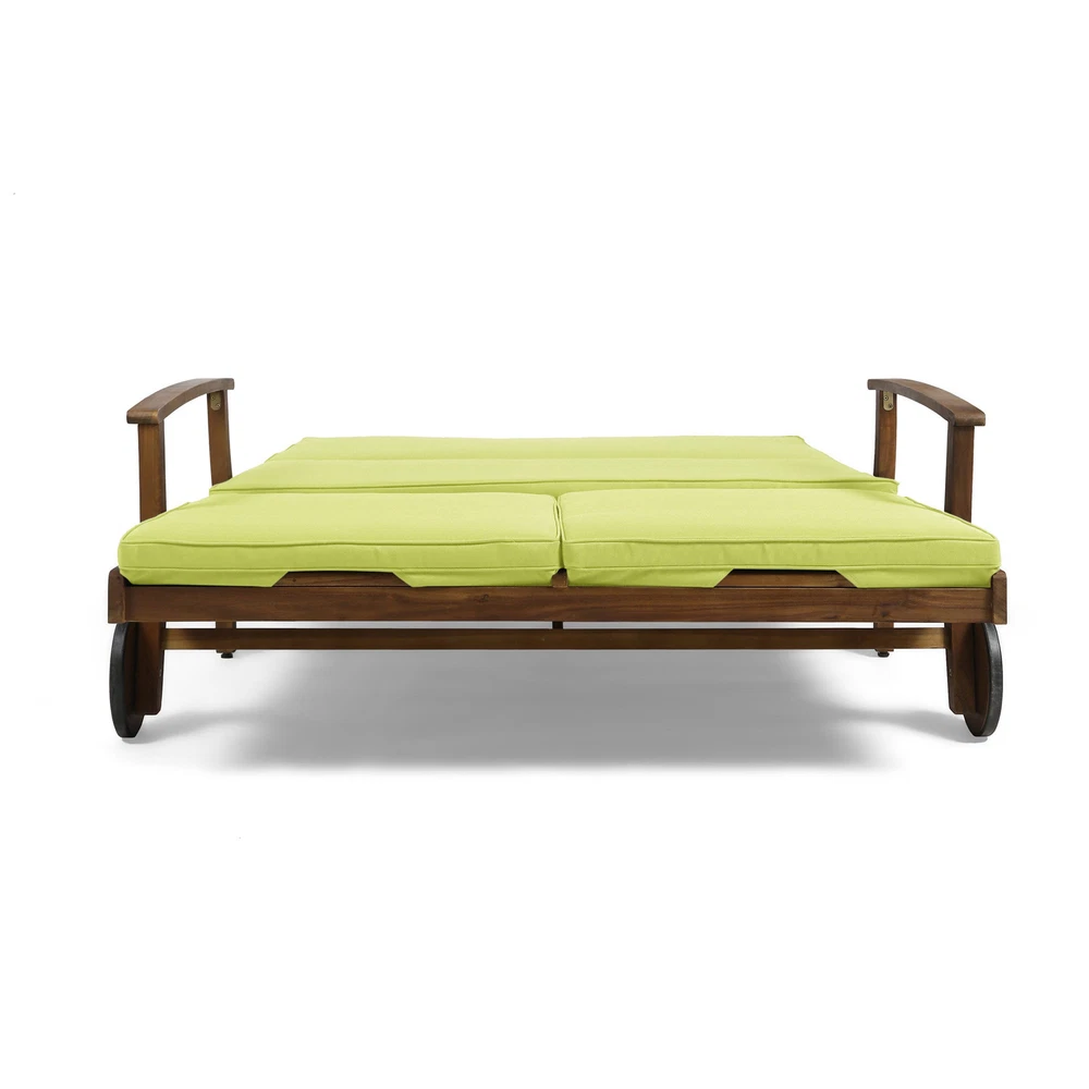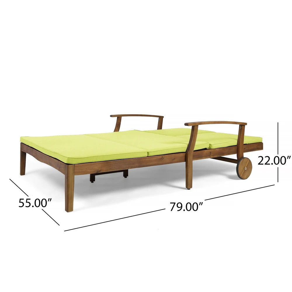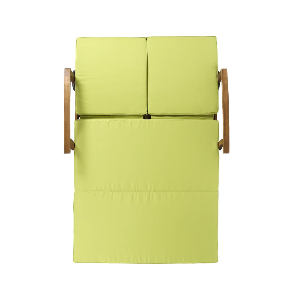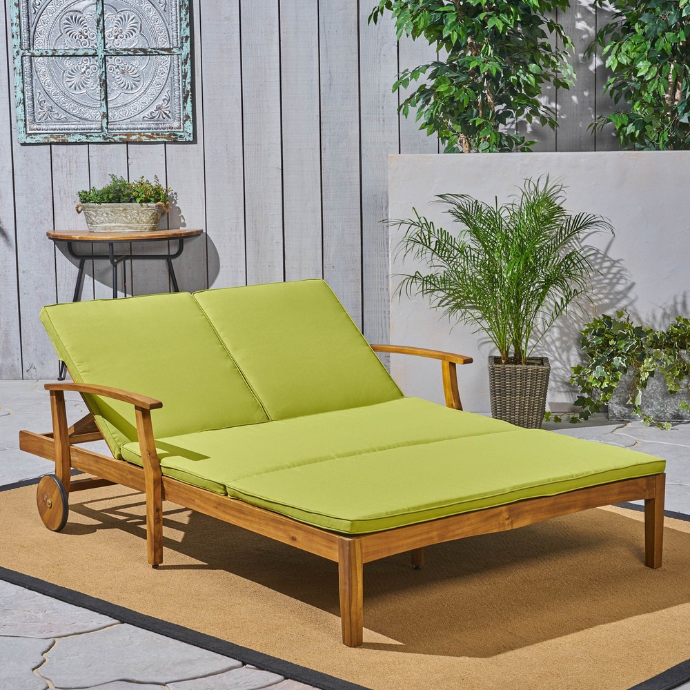 Specifications Place of Origin #originPlace# Main Color Teak Main Material Acacia Wood Dangerous Goods #dangerFlag# Dimensions & Weights Assembled Length (in.) 79.25 Assembled Width (in.) 56.25 Assembled Height (in.) 37.25 Weight (lbs) 92.59 Product Features Invite your favorite person to relax in style on this dual chaise lounger for porch, patio, or yard. A POOLSIDE MUST-HAVE - Quick-drying cushioning and frame make this a natural choice for one looking to relax on their poolside deck. FULLY ADJUSTABLE - Both sides can be adjusted independently of one another according to each user's own personal preference. MODERN APPEAL - Timeless details such as an exposed acacia wood frame in teak, chic slats, carved accents, and a unique cross-back design make the Perla an unforgettable complement in any outdoor living space. LAVISH COMFORT - Fashionable, water-resistant cushions in green with piped edges cradle you and your guest lovingly, allowing you to relax at length and enjoy the fresh air. Description