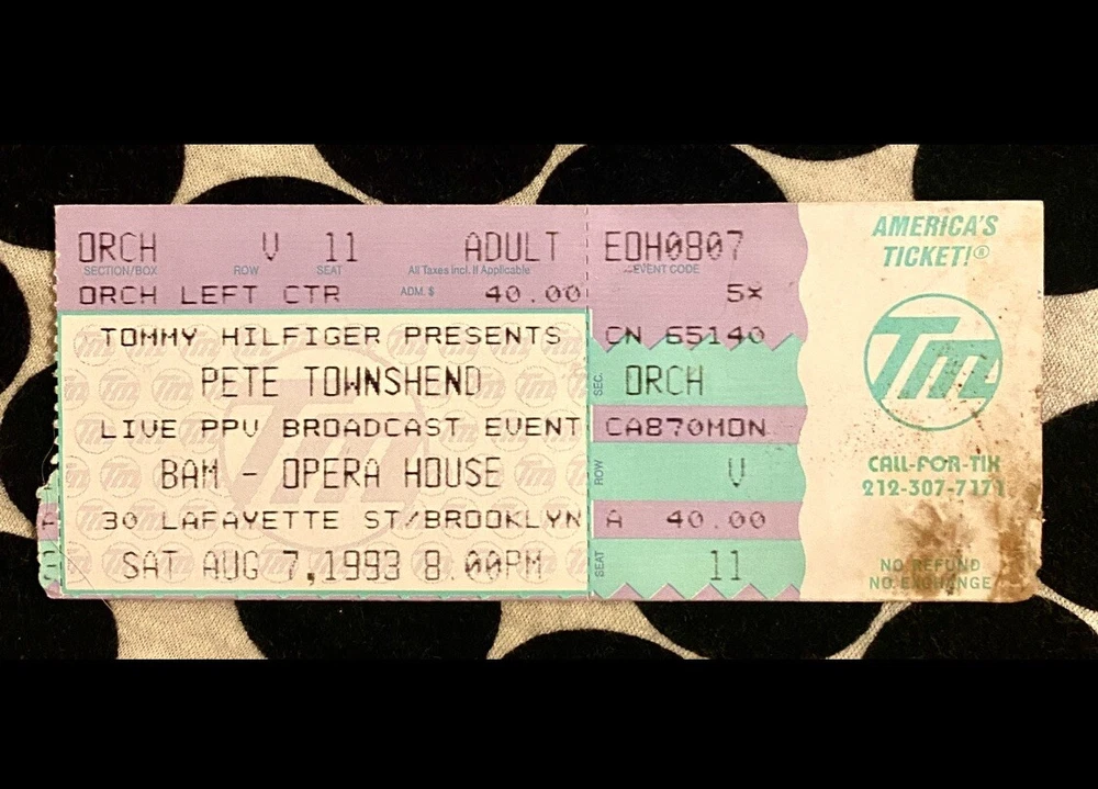 PETE TOWNSHEND - PSYCHODERELICT TOUR - BAM BROOKLYN ACADEMY OF MUSIC - AUG 7, 1993. THE WHO! Setlist Set 1 Pinball Wizard (The Who song) See Me, Feel Me (The Who song) Let My Love Open the Door Rough Boys Behind Blue Eyes (The Who song) The Kids Are Alright (The Who song) Keep Me Turning (Pete Townshend & Ronnie Lane cover) Eminence Front (The Who song) English Boy Meher Baba M3 Let's Get Pretentious Meher Baba M4 (Signal Box) Early Morning Dreams I Want That Thing Outlive the Dinosaur Gridlife 1 Flame (Demo) Now and Then I Am Afraid Gridlife 2 Don't Try to Make Me Real Predictable Flame Meher Baba M5 (Vivaldi) Fake It Now And Then (Reprise) Baba O'Riley (Demo) English Boy (Reprise) Set 2 North Country Girl A Little Is Enough You Better You Bet (The Who song) Goodnight, Irene (Lead Belly cover) That Kind of Thing (J.J. Cale cover) Save It for Later (The Beat cover) Face the Face Won't Get Fooled Again (The Who song) Let's See Action (The Who song) Magic Bus (The Who song)