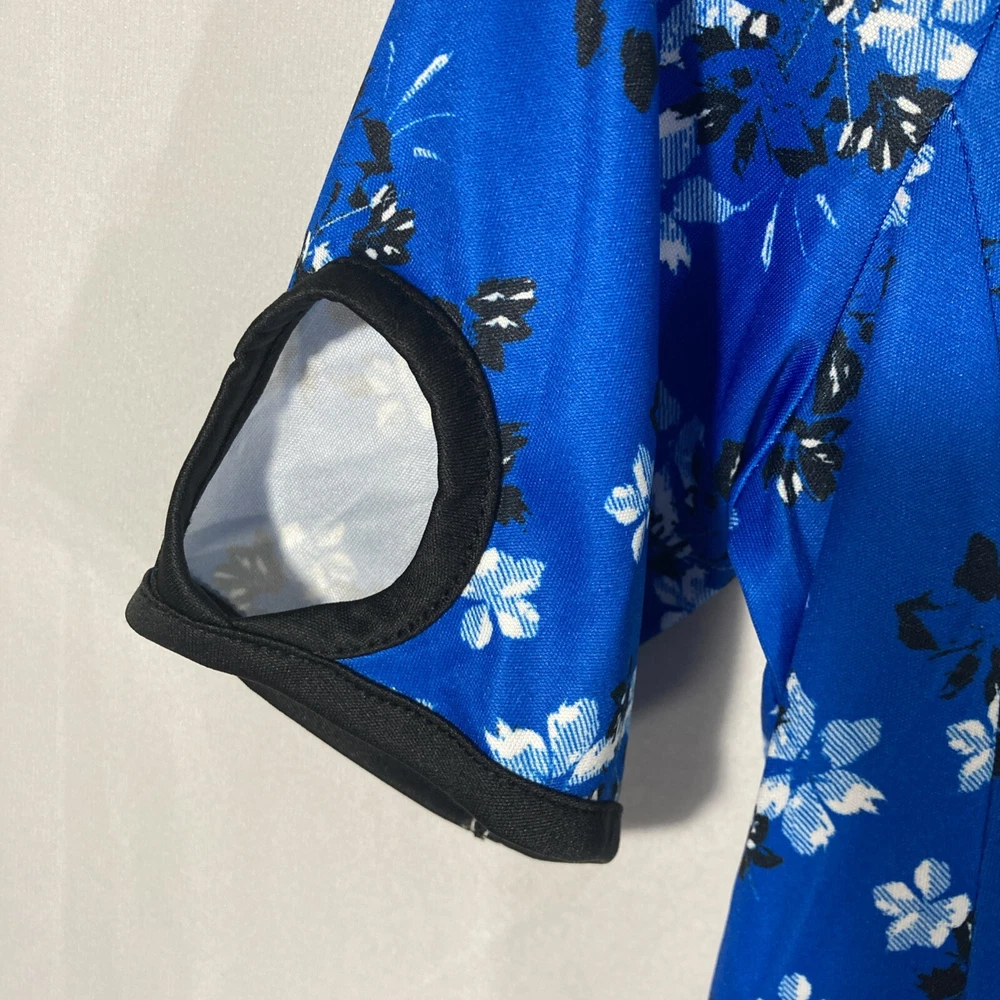 V-cut Fold down collar Black trim Stretchy satin look material Bust 30" Length 24"