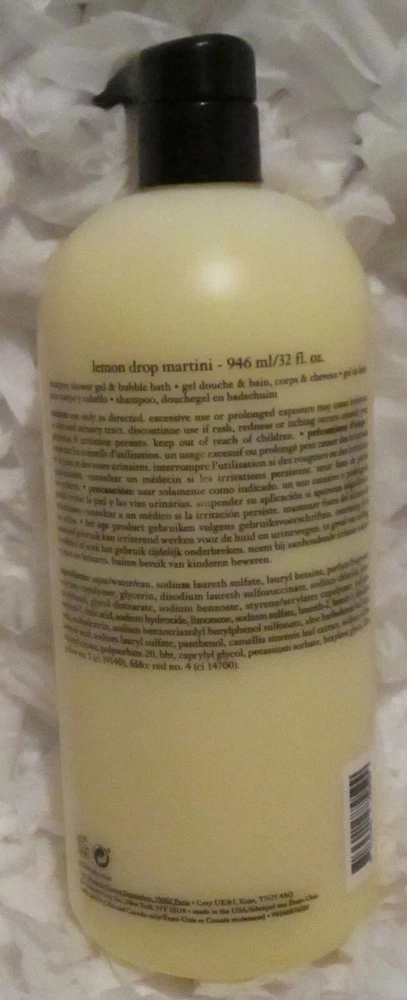 Product Line: PHILOSOPHY Formulation: Liquid Body Area: Body, Hair Brand: Philosophy Color: LEMON Volume: 32 fl. oz BOTTLE Scent: LEMON DROP MARTINI Skin Type: ALL SKIN TYPES Department: Women Ingredients: Water/Fragrance/Glycerin/camellia leaf extract Features: COMPLETE W/PUMPS FOR EASY DISPENSE, 3-in-1 Type: SHAMPOO,SHOWER GEL & BUBBLE BATH Size: XL 946 ml/32 fl. oz Country/Region of Manufacture: United States