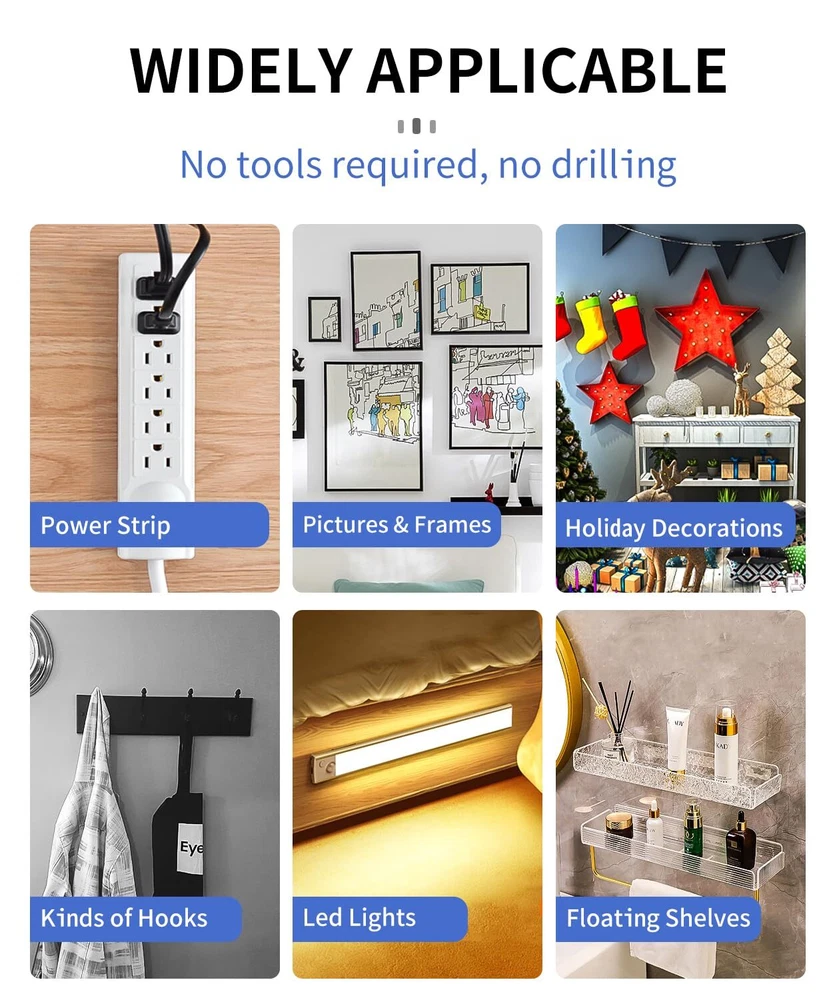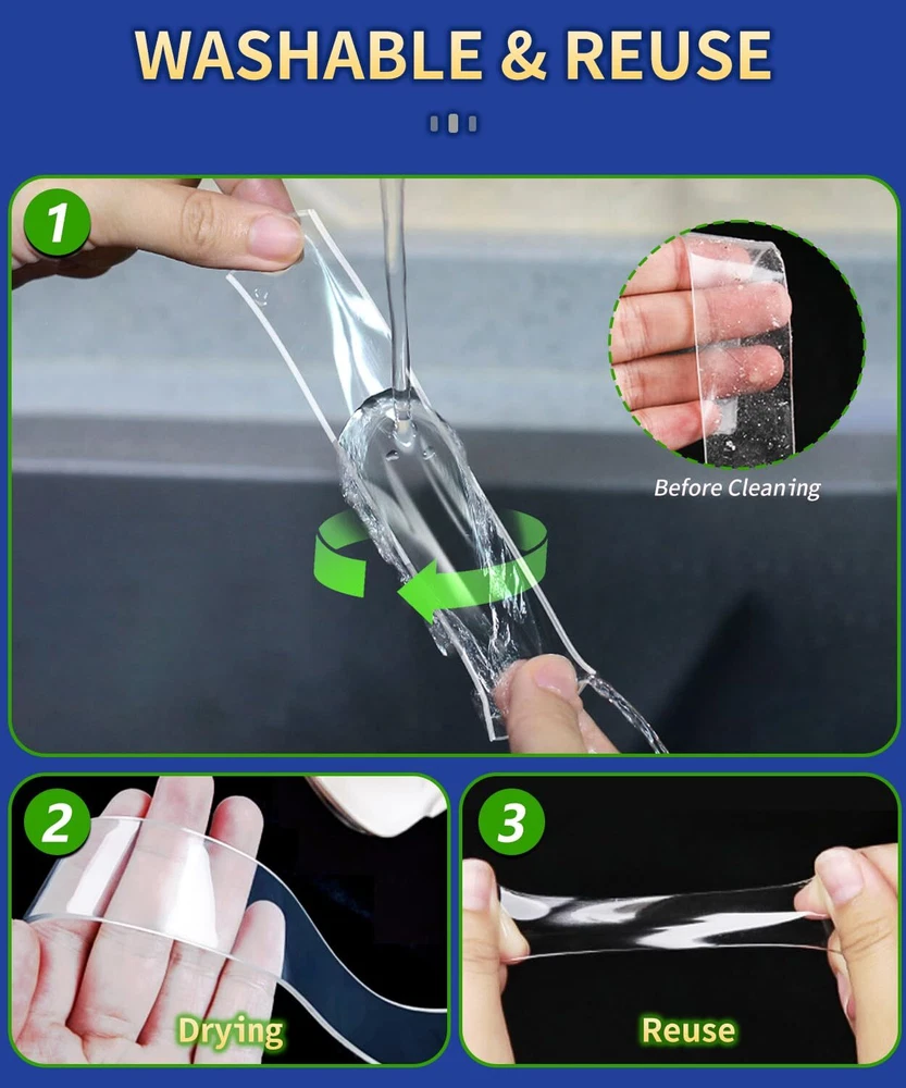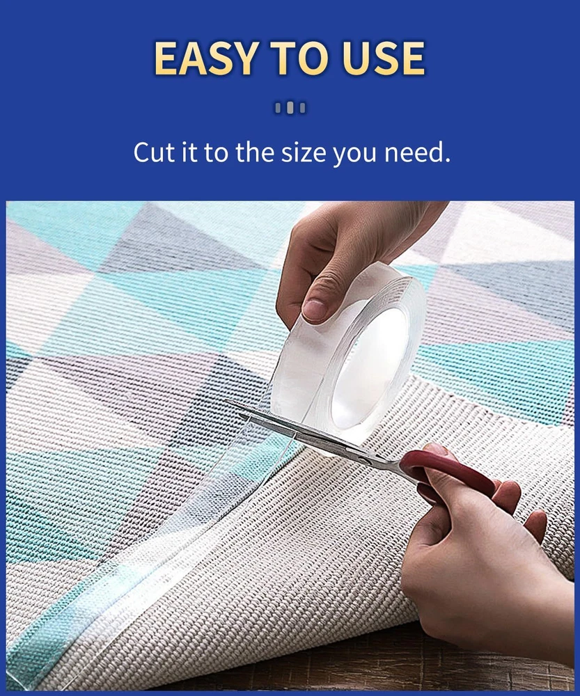 【Multi-function tape】 This is our strongest double-sided tape by now. We enormously improve the viscosity while taking its toughness into consideration, so that the tape can not only bear strong load, but also be easily disassembled without leaving traces. You can use it to fix almost anything, whether you are permanently fixed or short-term fixed, it can always satisfy your needs easily. 【Easy to remove without trace】The removable double-sided adhesive tape will not leave any residue on the surface of the object, which is easy to remove and can be used repeatedly. Please note: if the wall base is not firmly painted, the wall may fall off when the adhesive tape is removed. 【Super Heavy Duty Adhesive Tape】 By virtue of its super load-bearing capacity, you can hang things without drilling on the wall and can be permanently fixed. As long as you follow the steps in the product manual, you can exert the maximum viscosity of the tape. 【Crystal Clear】 This permanently transparent double-sided tape is crystal clear and will not turn yellow as the time fade away. It is a perfect transparent tape and can more beautifully complete your DIY project. 【Versatile Uses Meet all Your Needs】 This double-sided tape can be adhered to almost anything with smooth surface. You can paste anything anywhere. For example, use it to fix or paste pictures, photos, photo frames, wall stickers, posters, hooks, shelves, mobile phone holders, carpets, power outlets, holiday decorations, DIY items, etc. It is an indispensable product in daily life, which will bring great convenience to your life!