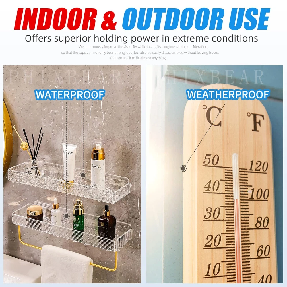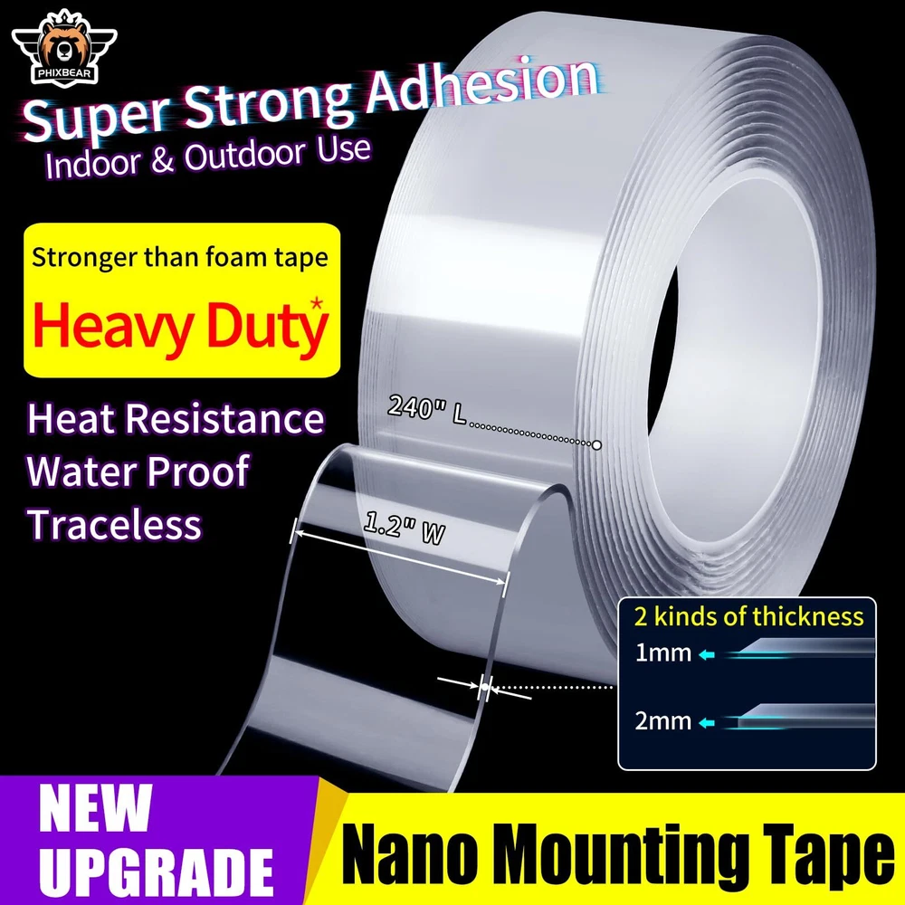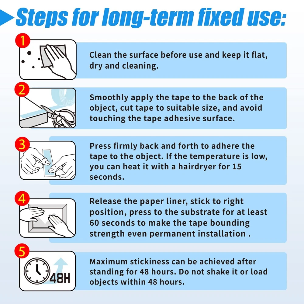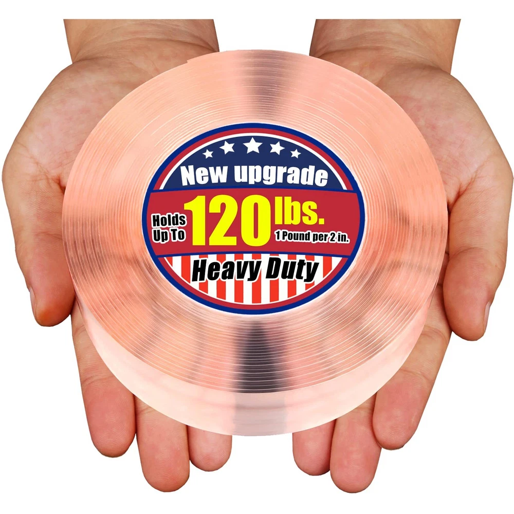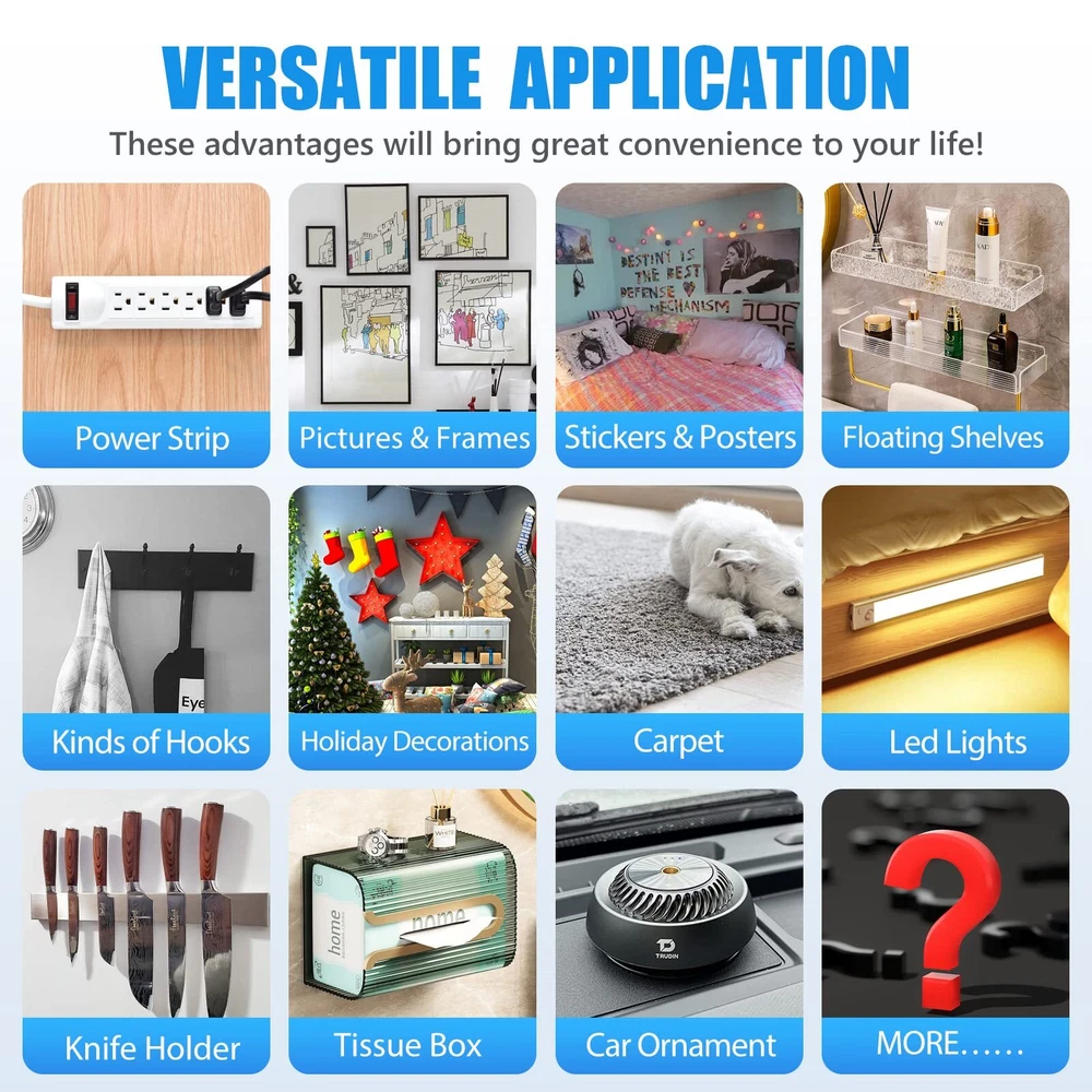 【Multi-function tape】 This is our strongest double-sided tape by now. We enormously improve the viscosity while taking its toughness into consideration, so that the tape can not only bear strong load, but also be easily disassembled without leaving traces. You can use it to fix almost anything, whether you are permanently fixed or short-term fixed, it can always satisfy your needs easily. 【Easy to remove without trace】The removable double-sided adhesive tape will not leave any residue on the surface of the object, which is easy to remove and can be used repeatedly. Please note: if the wall base is not firmly painted, the wall may fall off when the adhesive tape is removed. 【Super Heavy Duty Adhesive Tape】 By virtue of its super load-bearing capacity, you can hang things without drilling on the wall and can be permanently fixed. As long as you follow the steps in the product manual, you can exert the maximum viscosity of the tape. 【Crystal Clear】 This permanently transparent double-sided tape is crystal clear and will not turn yellow as the time fade away. It is a perfect transparent tape and can more beautifully complete your DIY project. 【Versatile Uses Meet all Your Needs】 This double-sided tape can be adhered to almost anything with smooth surface. You can paste anything anywhere. For example, use it to fix or paste pictures, photos, photo frames, wall stickers, posters, hooks, shelves, mobile phone holders, carpets, power outlets, holiday decorations, DIY items, etc. It is an indispensable product in daily life, which will bring great convenience to your life!