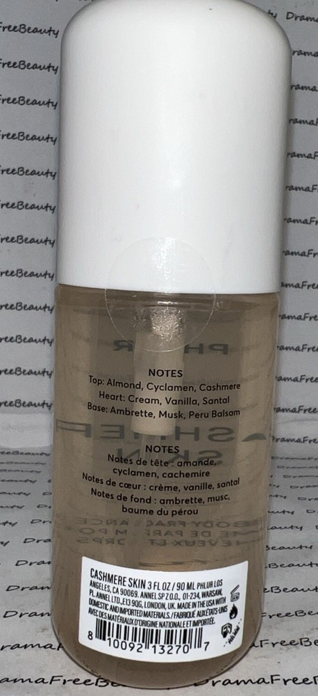Size Type: Travel Size gtin13: 810092132707 Brand: PHLUR UPC: 810092132707 Scent: Cashmere Skin, Almond, Cyclamen, Cashere, Cream, Vanilla, Santal, Ambrette, Musk Volume: 3 fl oz Fragrance Name: Cashmere Skin Features: Cruelty-Free/No Animal Testing Type: Body Mist