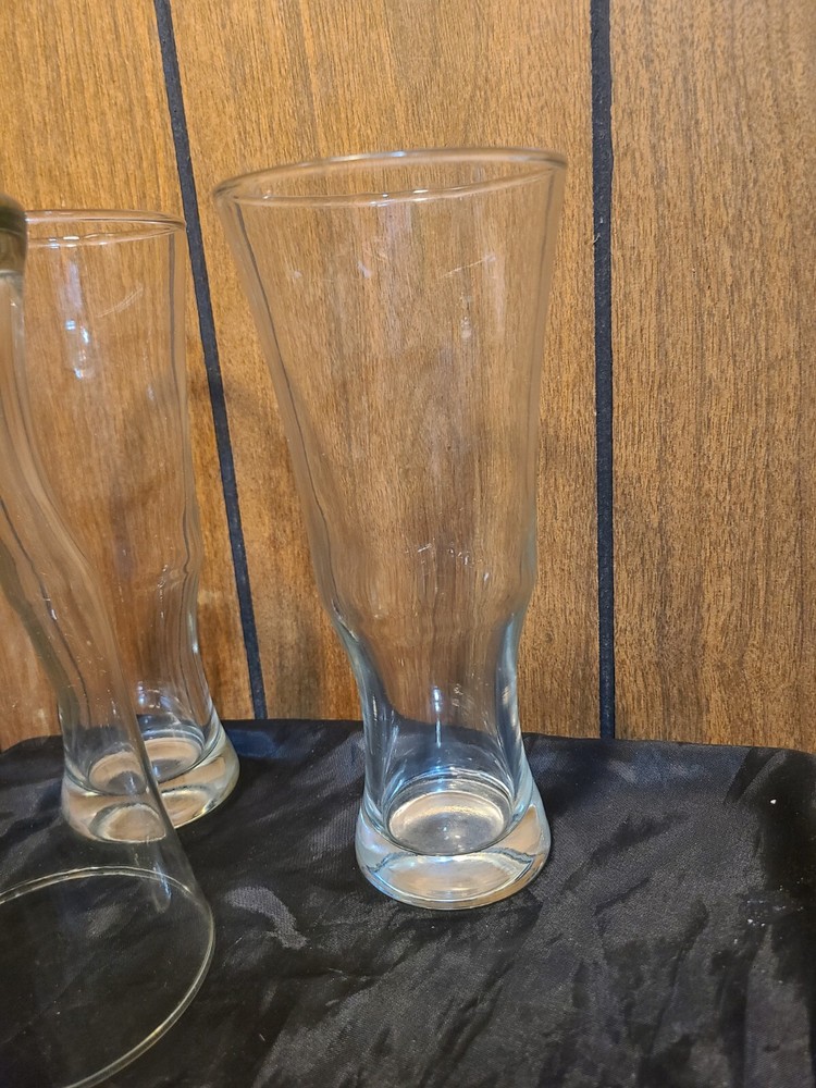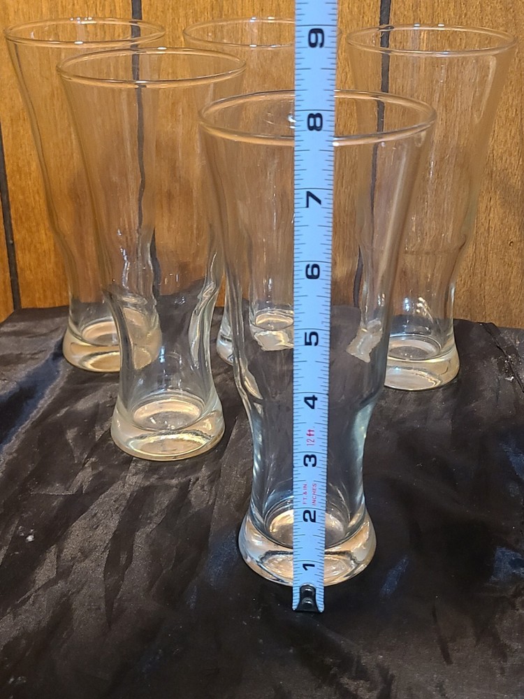 FIVE 7.5 inch tall, 20oz PILSNER BEER GLASSES. No chips or cracks. Thick, heavy, quality glass