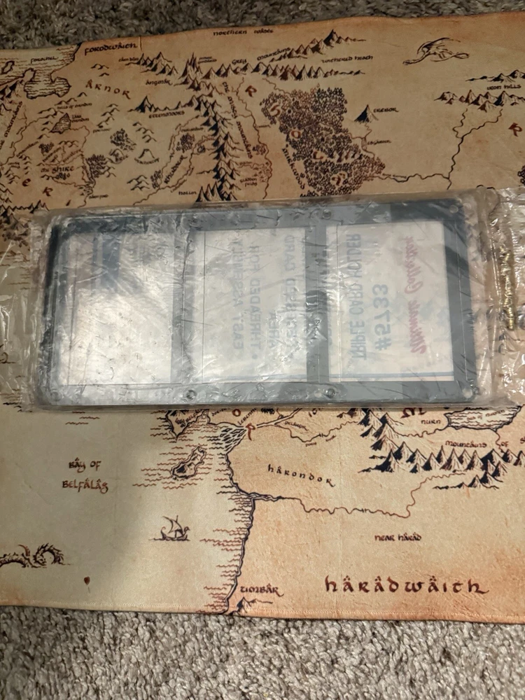The PKK Three Card Display is a screw-down card holder made of clear plastic with a black border. It can hold 3 standard-sized cards and comes with screws for secure display. This item is designed to showcase trading cards and keep them protected.