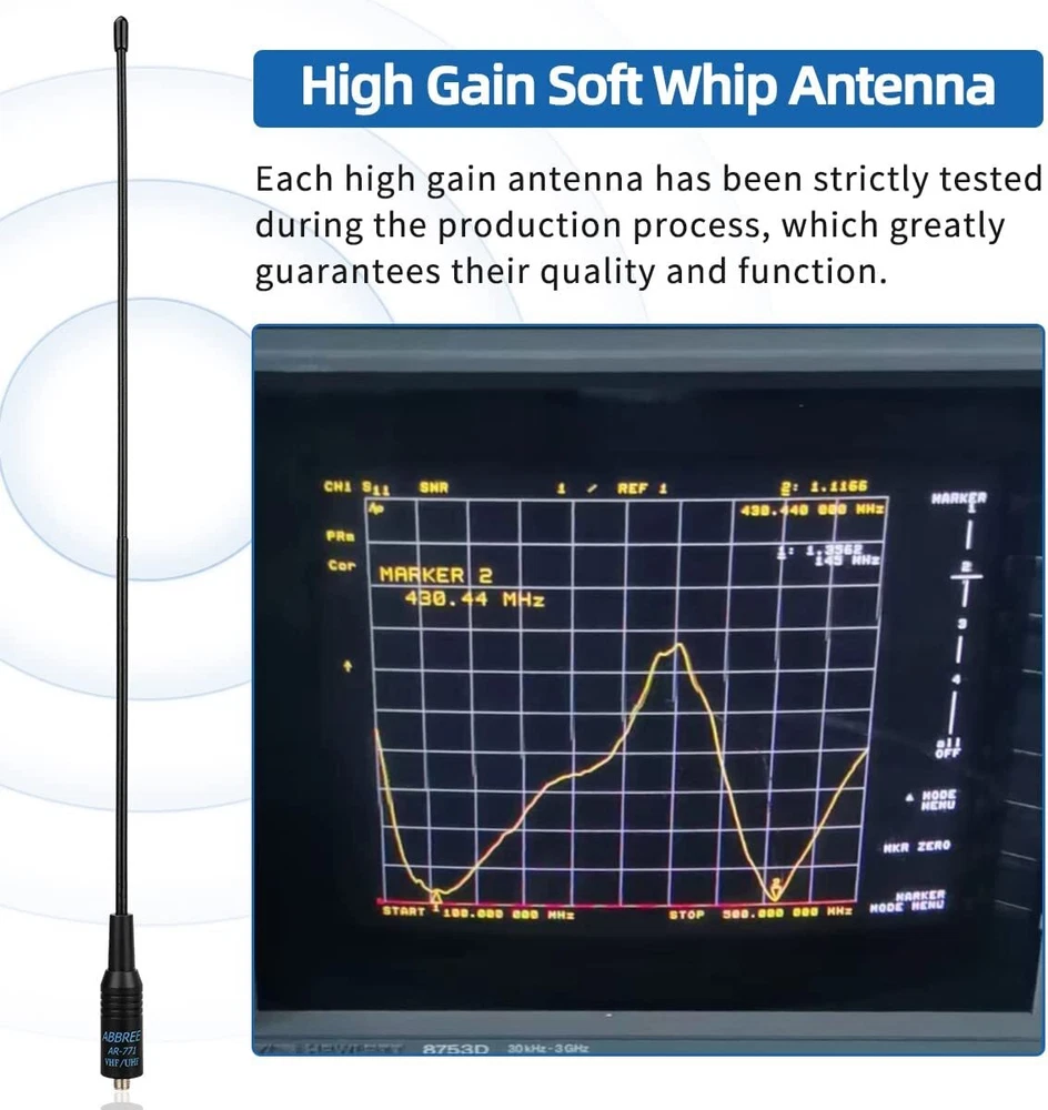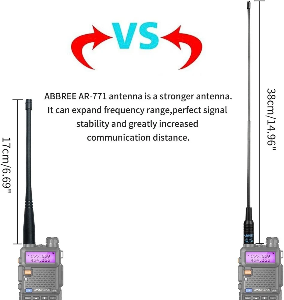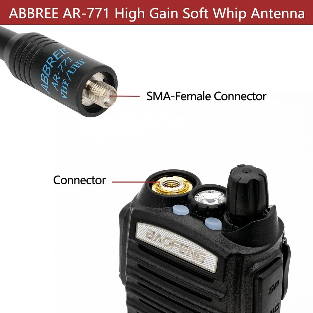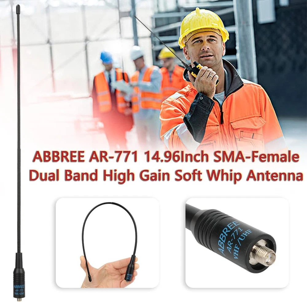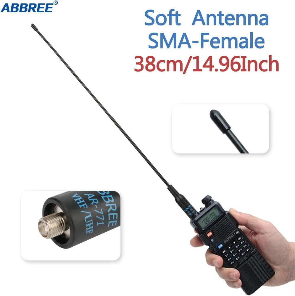 Specifications: Model: ABBREE AR-771 Band: Dual band VHF/UHF Connector: SMA-Female Frequency: 144/430MHz Gain: 2.15dBi Max power: 10W VSWR: less than 1.5 Impedance: 50ohm Radiation: Omni Length: 14.96 inch/38c m COMPATIBLE MODEL Almost All of Baofeng: UV5R(All models),UV-82,BF-F8HP,BF-F8+,BF-H5,BF-H6,BF-H7,TP-8Plus,UV-S9Plus,BF-999/888/777/666s/777s/888s etc Baofeng Radio Models; Almost All of Kenwood: for Kenwood TH: TH-D7,TH-D7A,TH-D7AG,TH-D7E,TH-F6,TH-F6A,TH-F7,TH-F7E,TH-G71,TH-G71A,TH-G71E,TH-K2,TH-K2A,TH-K2E,TH-K2ET,TH-21,TH-21AT,TH-21BT,TH-22,Th-22A,TH-22At,TH-22E,TH-25,TH-26,TH-27 for Kenwood TK: TK-208/308,TK-220/320,TK-240/340,TK-240D/340D,TK-248/348,TK-250/350/353,TK-260/360,TK-260G/360G,TK-270/370,TK-270G/370G,TK-272G for Kenwood KPG: KPG27D,KPG29D,KPG48D,KPG49,KPG55D,KPG56 D,KPG62D,KPG66D,KPG69D,KPG70D,KPG74D,KPG75D,KPG77D,KPG82D WOUXUN:KG-689, KG-689 PLUS, KG-669, KG-669 PLUS, KG-659, KG-699E, KG-UVD1; PUXING:PX-777, PX-777 PLUS, PX-666, PX-888 QUANSHENG:TG-K4AT, TG-2AT, TG-45AT, TG-42AT, TG-22AT, TG-25AT, TG-UV WEIERWEI:VEV-3288S, VEV-6288, VEV-3288 LINTON:LT-3288, LT-6288, LT-3188, LT-2188, LT-3260, LT-3268, LT6188, LT3288 HYT:TC-268, TC-268S, TC-368, TC-368S, TC-370S, TC-500, TC-500S TYT:TH-UVF1 T2 T3 F6 300 500 600 800 900 9900 Note:Suitable for much SMA-Female Connector Radio Models. High Gain Soft Whip Antenna for Baofeng Kenwood TYT Two Way Radio This Antenna is about 14.96 inch/38cm length, light weight and easy to carry, and is a must for outdoor and camping usage. Package inculding one Rubber gasket to protect the antenna connector base of your radio
