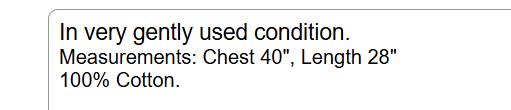 In very gently used condition. Measurements: Chest 40", Length 28" 100% Cotton. We are so thankful for our customers! However, we have thousands of listings, and therefore receive hundreds of messages, every single day. So, if you are asking about a price drop, or a shipping price drop, or asking for extra measurements, or to add additional photos, please allow me to answer you here, No thanks. If your question is not one of those questions, we will be happy to answer you individually. YES...WE DO COMBINE DOMESTIC SHIPPING. Extra jewelry items ship for $2 each (except for large jewelry lots). We will refund the difference as we are mailing out.....we hope you enjoy shopping with us! We encourage you to read the description and check all photos.