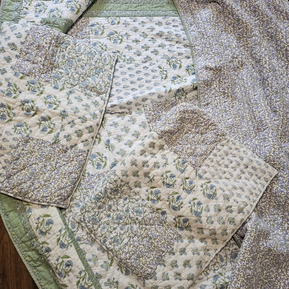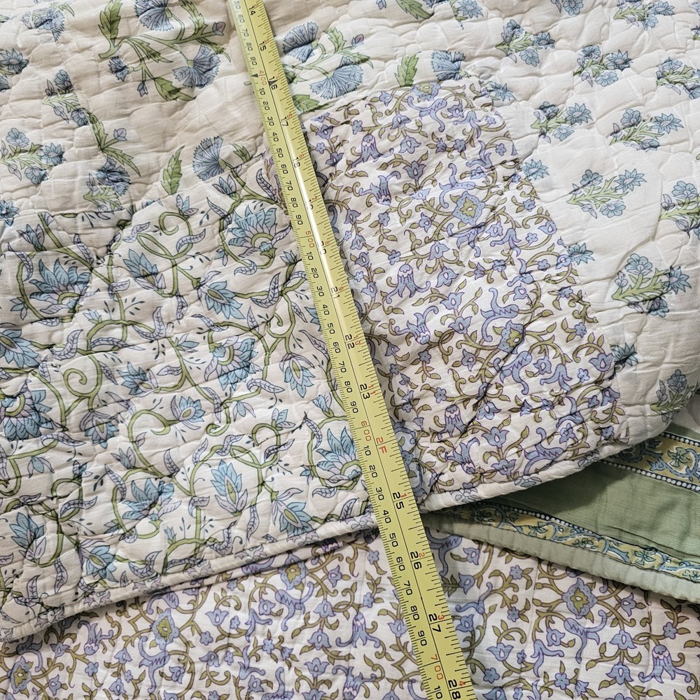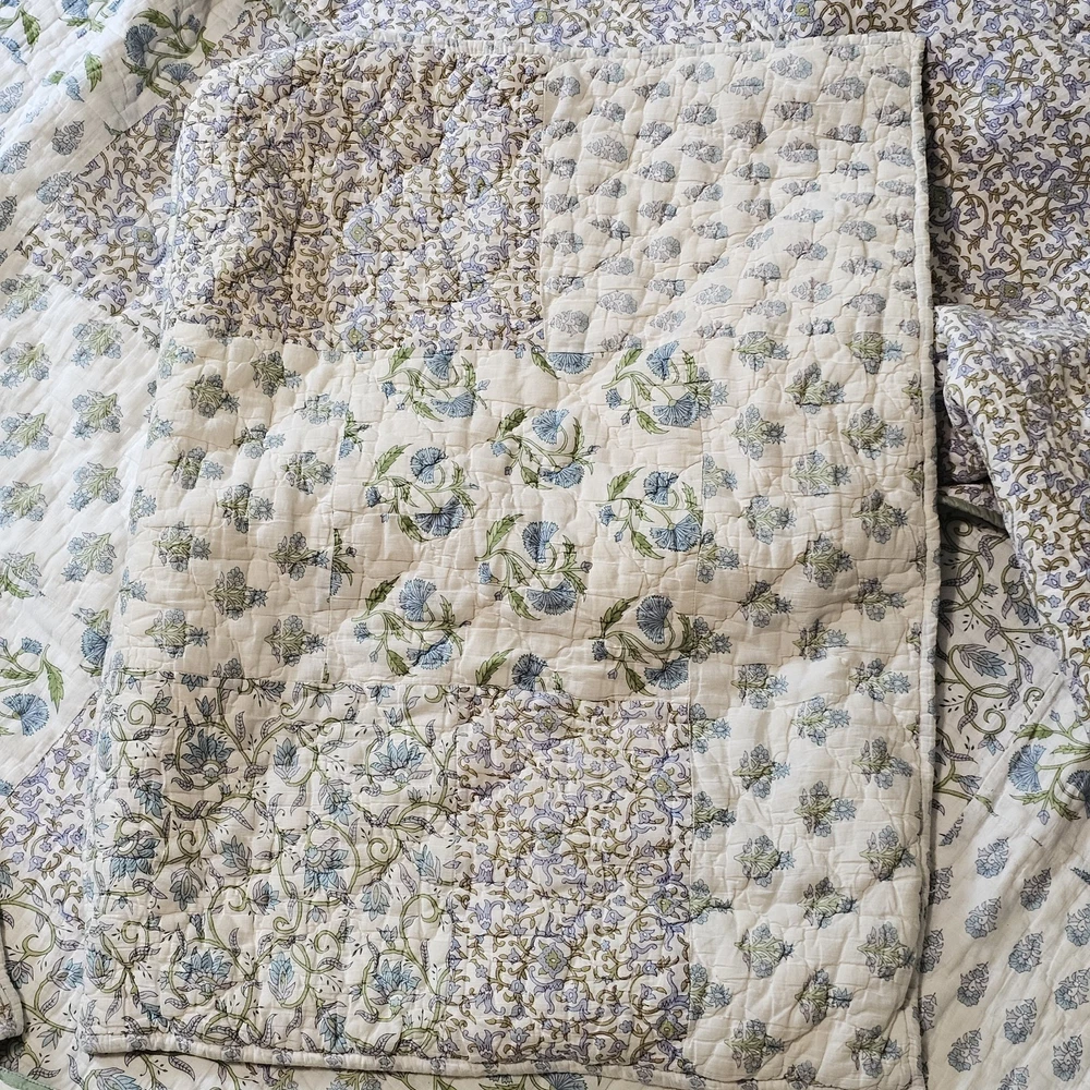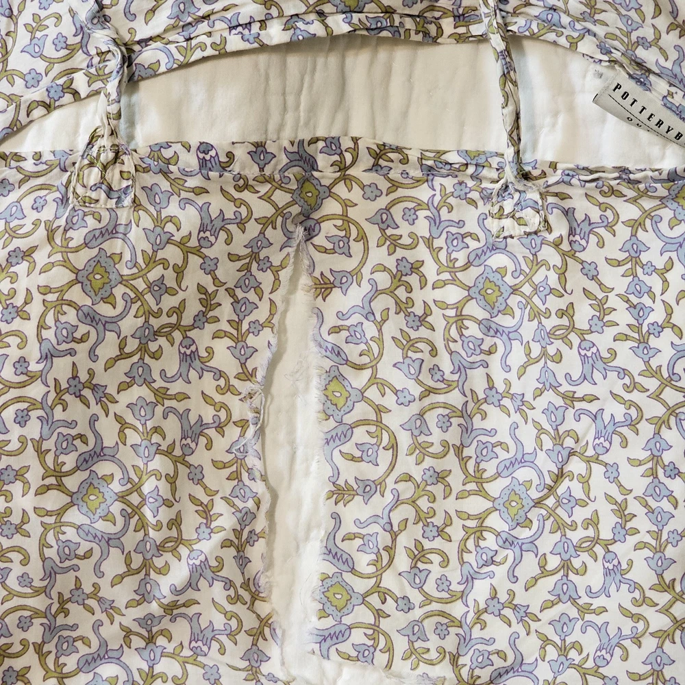 The Pottery Barn Floral Quilt Cottage Country King Bedspread with 2 Shams is a beautiful and stylish addition to any bedroom. Made from 100% cotton, this multicolor quilt set features a floral pattern and a country style design. Measuring 108x92 inches, this quilt set is perfect for adding a touch of cottage charm to your bedroom decor. Made in India by the renowned brand Pottery Barn, this quilted set will bring a touch of floral elegance to your bedroom. Vintage 2005. Both of the Shams have tears on the backside. See photos for wear sold as is