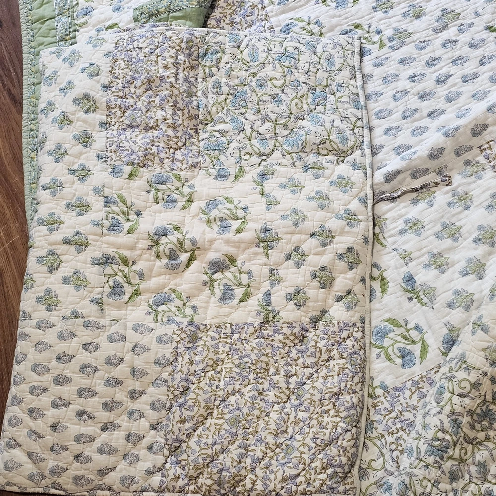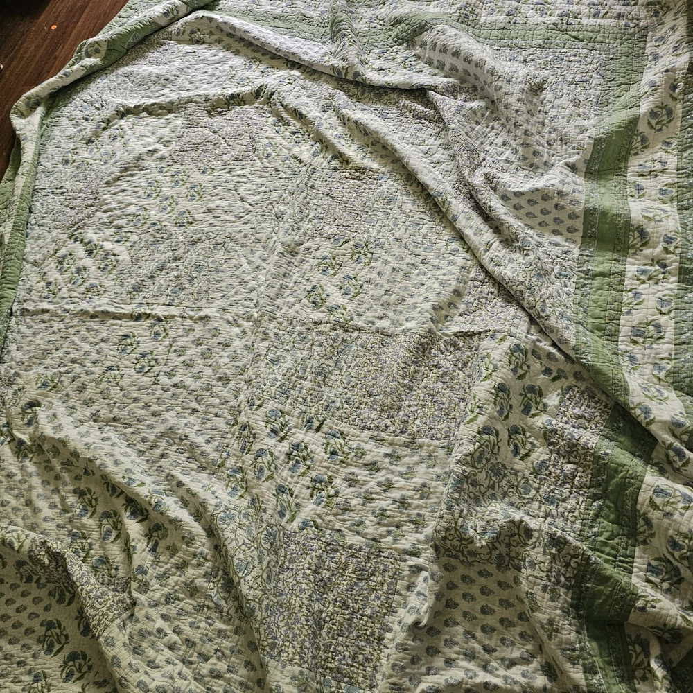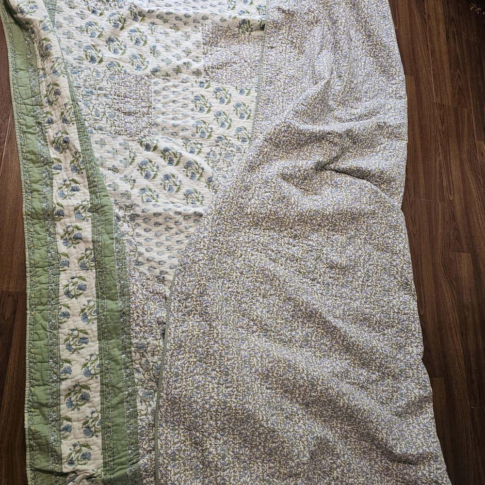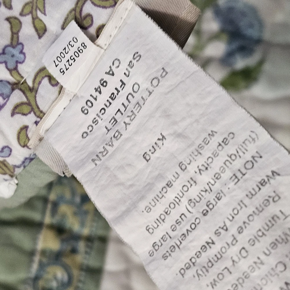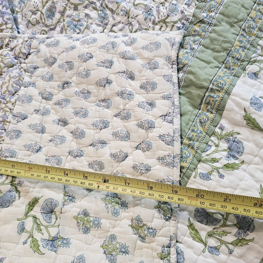 The Pottery Barn Floral Quilt Cottage Country King Bedspread with 2 Shams is a beautiful and stylish addition to any bedroom. Made from 100% cotton, this multicolor quilt set features a floral pattern and a country style design. Measuring 108x92 inches, this quilt set is perfect for adding a touch of cottage charm to your bedroom decor. Made in India by the renowned brand Pottery Barn, this quilted set will bring a touch of floral elegance to your bedroom. Vintage 2005. Both of the Shams have tears on the backside. See photos for wear sold as is