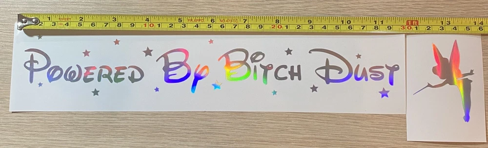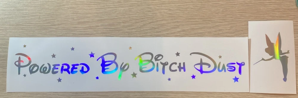 MADE IN USA. FREE SHIPPING ***This listing is for ONE~12.367 Wide x 3.005 Tall~“Powered By Bitch Dust~HOLOGRAPHIC COLOR ~Vinyl Decal Sticker *** SEE ALL PHOTOS -***Perfect for your car window, or any clean, smooth non-porous surface ***Comes with easy to install instructions ***No Background - Your Background is what you apply the decal to. ***Mailed in a Stamped Envelope~ NO TRACKING # FREE SHIPPING ***If you have any questions please feel free to contact me, I will be more than happy to assist you Thank You