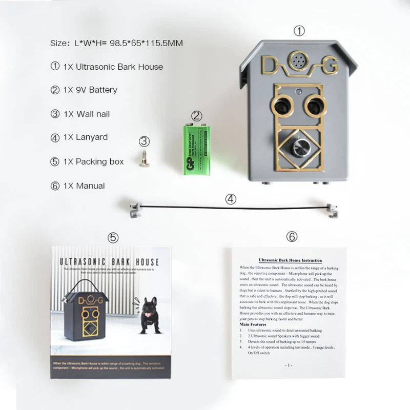 DESCRIPTION Stop nuisance barking without using a collar with the newest version of the global bestselling ultrasonic bark deterrent. The UL20 Ultrasonic Bark House has two ultrasonic speakers which effectively doubles the intensity of the original bark house model. The device detects barking up to 15 metres away then emits ultrasonic sound that is irritating to the dog but quiet to humans. The dog will quickly associate the ultrasonic sound to barking, which will stop or significantly reduce unwanted barking. This is safe, fast and efficient. You are able to target multiple dogs with one device! 9v battery is included in every box. UL20 Ultrasonic Bark Deterrent Features: Uses ultrasonic sound to deter unwanted barking Detects the sound of barking up to 15 meters 4 levels of operation including test mode , 3 range levels , On/Off switch 9v battery is included in every box Durable and weatherproof for outdoor use. Safe for indoor use. LED power/low battery indication.