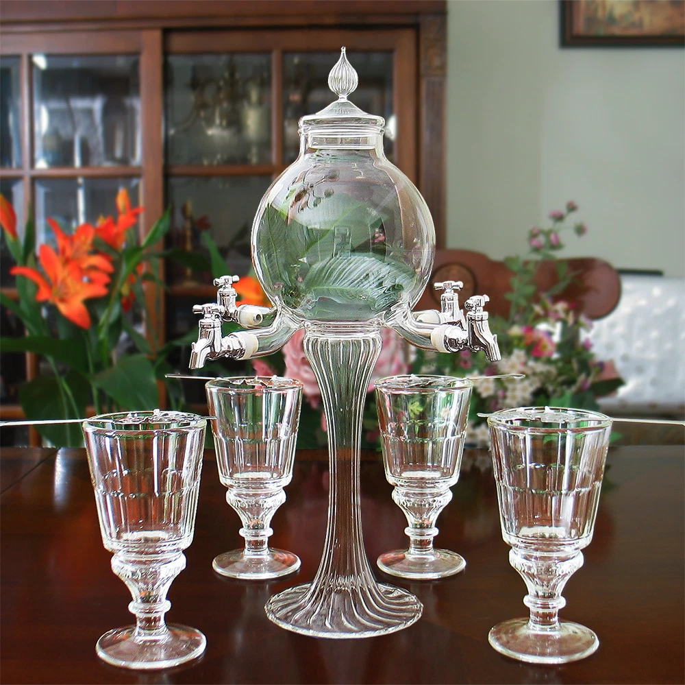 Genuine AbsintheOnTheNet.com Absinthe Fountain The Premium 4 spout Rozier Absinthe fountain is mouth-blown, lead-free crystal, lightweight and delicate yet extremely durable with a serrated base. Set is available with fountain and either 4 Pontarlier glasses and 4 Premium Leaf spoons or with 2 Pontarlier glasses and 2 Premium Leaf spoons . Fountain can also be purchased individually. Use dropdown to chose your set. Also includes Sugar Cubes and illustrated instructions for preparing your absinthe. Ships from inside USA - no problems with Customs, shipping damage, returns or exchanges. MORE ABSINTHE FOUNTAINS AT ABSINTHE ON THE NET Set Includes EVERYTHING! Absinthe Fountain. Imported from Europe. 18 in. tall with top, 8 in. table to spouts, holds 1200 ml 2 or 4 Authentic La Rochere Pontarlier Glasses. Imported from France. 6 ½ inches, 10 oz. 2 or 4 Premium Leaf Spoons. Stainless Steel 6 in. Sugar Cubes Illustrated Instructions For Preparing Your Absinthe *Returns only available for unused items. Correct and sufficient packaging of returned items is the responsibility of the buyer. Items broken during return shipping will receive no credit or refund. *Professional packaging and shipping insurance recommended.