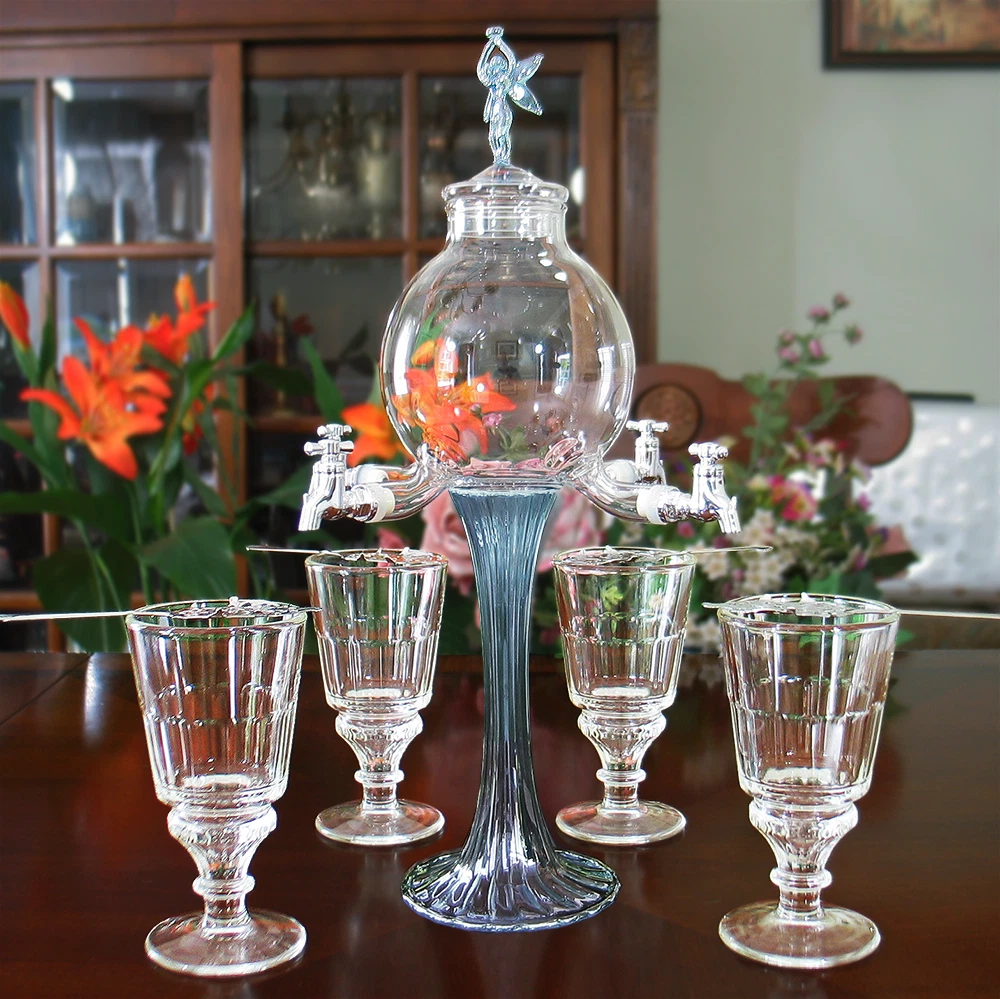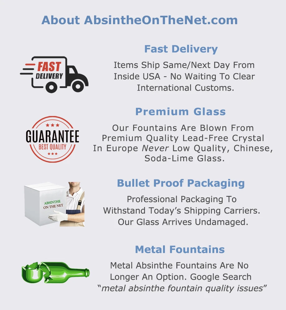 Genuine AbsintheOnTheNet.com Absinthe Fountain The Premium 4 spout Rozier Fee Absinthe fountain is mouth-blown with an iridescent blue Fairy on top and serrated, blue base. Fountain is lead-free crystal, lightweight and delicate yet extremely durable and imported from Europe. It is hand made and as such, variations in color and Fairy design will occur. Set is available with fountain and either 4 La Rochere Pontarlier glasses (Imported From France) and 4 Classic Wormwood Leaf spoons or with 2 La Rochere Pontarlier glasses (Imported From France) and 2 Classic Leaf spoons. Fountain sets with glasses and spoons also include La Rochere glass sugar bowl (Imported From France). Fountain can also be purchased individually. Use drop-down to chose your set. Also includes Sugar Cubes and illustrated instructions for preparing your absinthe. Ships from inside USA - no problems with Customs, shipping damage, returns or exchanges. Please Note : This is a premium crystal fountain produced in Europe. It is not a Chinese, soda-lime glass fountain. Know what you are buying. MORE ABSINTHE FOUNTAINS AT ABSINTHE ON THE NET Set Includes EVERYTHING! Absinthe Fountain. Imported from Europe. 18 in. tall with top, 8 in. table to spouts, holds 1200 ml 2 or 4 Authentic La Rochere Pontarlier Glasses. Imported From France. 6 ½ inches, 10 oz. 2 or 4 Leaf Spoons. Stainless Steel 6 in. La Rochere Glass Sugar Bowl. Imported From France 3.5" x 2.1", 5.1 oz Sugar Cubes Illustrated Instructions For Preparing Your Absinthe *Returns only available for unused items. Correct and sufficient packaging of returned items is the responsibility of the buyer. Items broken during return shipping will receive no credit or refund. *Professional packaging and shipping insurance recommended.