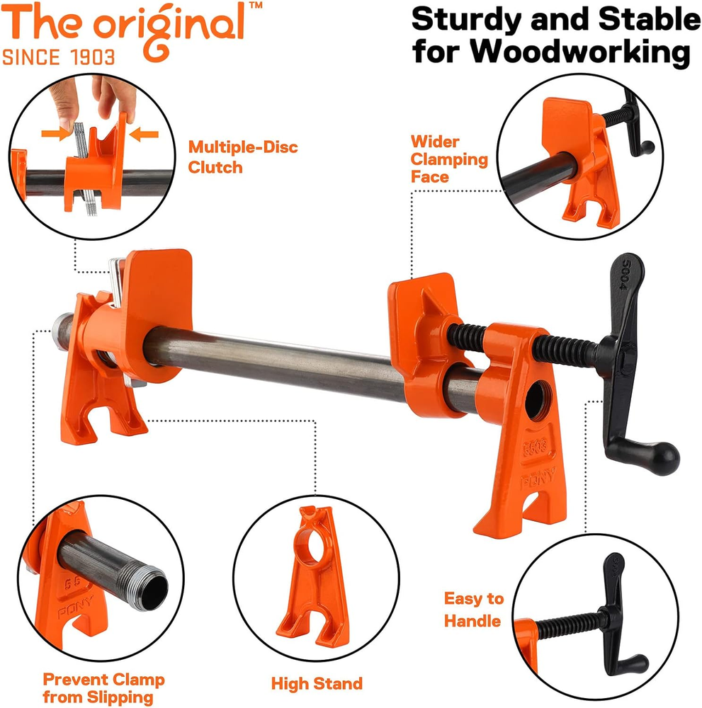 Store New Arrivals Add to Favorite View Feedback Contact PRO 2-Pack Heavy-Duty Wood Gluing Pipe Clamp Fixture for 3/4 Inch Black Pipe Description Item model number H_3/4_Inch Part Number 99221AE Style H Style 3/4 Inch Size H Style 3/4 Inch Power Source Hand Powered Item Package Quantity 2 Color Orange Pattern Pro Design Material Cast Iron Batteries Required? No Item Weight 8.75 pounds Batteries Included? No Set Name 2-Pack Package Dimensions 12.6 x 7.48 x 4.29 inches Included Components 2PC PRO 3/4" PIPE CLAMP FIXTURE 【PONY PRO 3/4” Pipe Clamps】 Suitable for 3/4” with any length of black pipe. Our wood clamps are professional for you to release your hands and work more efficiently. 【Wide Applications】 PONY sturdy pipe clamps for woodworking are great for almost any length of woodworking project. The big clamping face is suitable for more woodworking projects. The clamping face is 2-1/8". 【Iron Cast Material】 Made of tough iron cast, equipped with multiple-disc clutch for high clamping pressure, providing quick and secure adjustment. Removing the clamps when the job is done is quick and easy every time. 【High Stand】2-3/8” high stand provides stable work base. Our gluing pipe clamp is great for woodworking in home or store. With the help of pipe clamps, professional and efficient woodworking operations can be achieved in a fraction of the time. 【Easy to Use】 Adjust the handle to strengthen the clamping force and add a coil spring to prevent clamps from slipping. Easy to assemble, ideal for woodworking with a wide range of applications from industrial to do-it-yourself type projects. Product description Big clamping face is suitable for most woodworking projects. 2-3/8” high stand provides stable work base and helps you improve work efficiency. ABOUT US We offer the best prices around on high quality products. Our E-store includes media such as books, movies, music and games while offering electronics, toys, sporting apparel, clothing, tools, general home, garden items and more. SHIPPING We are always working hard to ensure your package arrives as soon as possible. Please understand that some factors like weather, high postal traffic, and the performance of shipping companies are outside of our control. We offer free shipping to the lower 48 states and ship within 2 business days of payment, usually sooner. We do not accept P.O. Boxes. Please provide a physical address. RETURNS We offer a 30-Day Return Policy on items which you are not completely satisfied with. You have the option for a full-refund or an exchange of the item. No returns are available on items shipped outside of the USA. PAYMENT We accept PayPal. CONTACT US This page content is yet to come Please ad us to your favorite seller and visit again later Thank You CUSTOMER SATISFACTION We try our very best to make sure every customer is completely satisfied. If there's a problem, message us! We're happy to help.