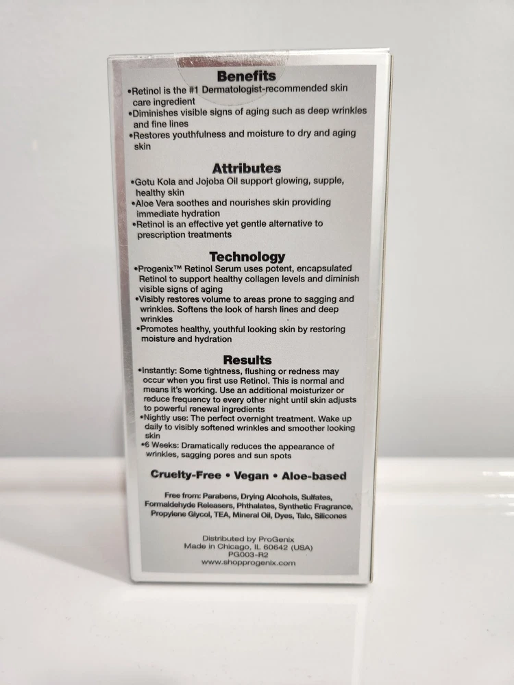 PROGENIX RETINOL ANTI-WRINKLE FACE SERUM - 1 FL OZ TARGETS DEEP WRINKLES AND DARK SPOTS! Progenix Professional Skin Care Retinol Anti-Wrinkle serum will target those deep wrinkles that other serums and anti-aging creams havent been able to cover. This anti-aging serum with retinol, Jojoba Oil, and Aloe Vera is gentle on the skin but tough on your wrinkles, dark spots, and fine lines. Can be used with other face moisturizers and creams, and oils. A great nighttime repair treatment, this best-selling serum that really works will leave you amazed when you wake up in the morning! This face serum with retinol from Progenix combines the best anti-aging ingredients to help combat the signs of aging. Encapsulated Retinol effectively minimizes the appearance of deep wrinkles, fine lines, age spots, and dark spots. Within just 6 Weeks this serum will dramatically reduce the appearance of wrinkles, sagging pores and sun spots. Anti-wrinkle face serum with retinol also contains Jojoba Oil & Aloe Vera to help hydrate and moisturize the skin. Hyaluronic Acid hydrates and plumps the skin to give your complexion a healthier and glowing appearance. Gotu Kola preserves and restores youthfulness to the skin by firming and tightening your skin. This serum can be used as a nighttime serum to help combat aging while you sleep. Wake up daily to visibly softened wrinkles and smoother looking skin. Can be used with other facial moisturizers or oils. Some tightness, flushing or redness may occur when you first use Retinol. This is normal and means its working. Use an additional moisturizer or reduce frequency to every other night until skin adjusts to powerful renewal ingredients. Sunscreen is highly recommended while using products with Retinol Paraben free. Safe alternative to injections. Not tested on animals. Made in USA. NEW IN ORIGINAL FACTORY SEALED BOX... GOOD LUCK!