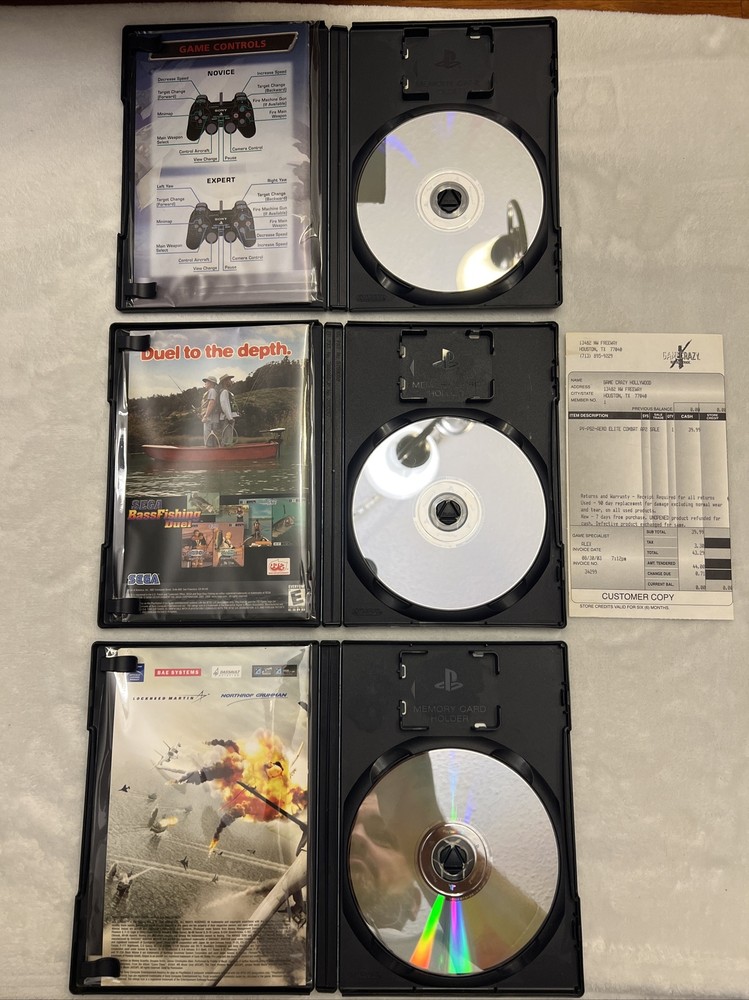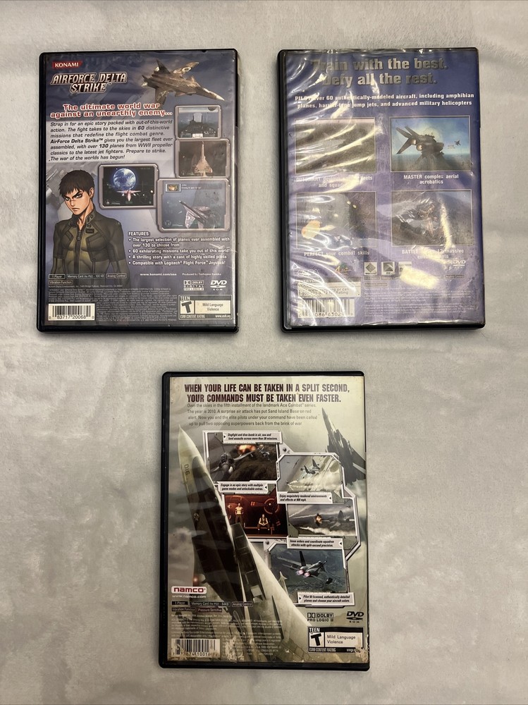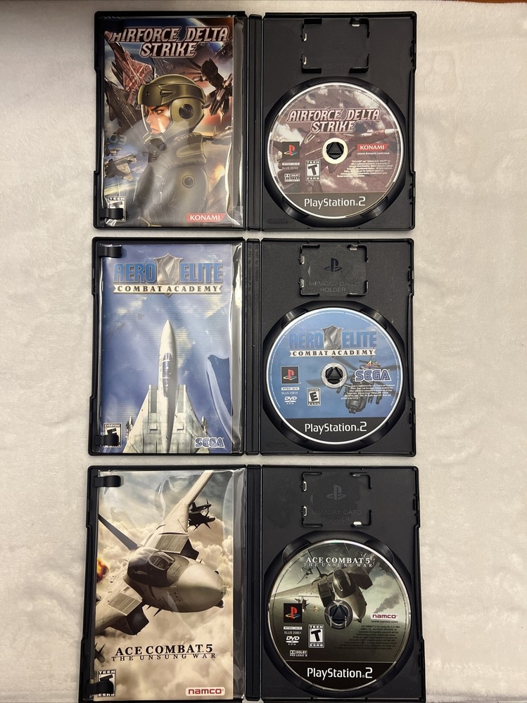 PS2 Flight Sim Bundle w/ Ace Combat 5, Aero Elite & AF Delta Strike, Free Ship!!. -Entire lot is clean/tested/cib -Covers are worn & aero elite academy disc has light scratches -Aero Elite Academy has the purchase receipt (see pics!)