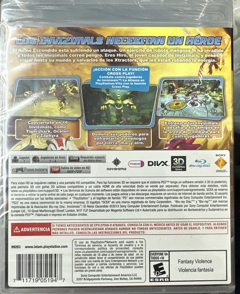Immerse yourself in the world of Invizimals with this PlayStation 3 game. Rated E10+ and featuring a mix of martial arts, extreme sports, boxing, and car racing, this game is sure to keep you entertained for hours. The game also includes multiplayer mode and a manual, making it easy to get started. With a region-free code and published by Sony, this game is perfect for anyone looking for a fun and exciting experience. The game is part of the Invizimals: The Lost Kingdom video game series and comes in a sealed package. Don't miss out on the chance to add this game to your collection. Español