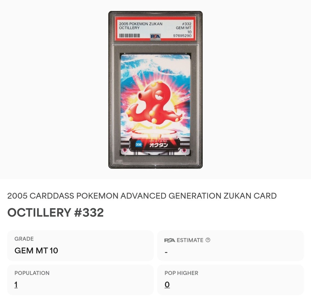 PSA 10 GEM MINT Octillery #332 Carddass Zukan Advanced Gen. Bandai Pokémon POP 1. POP 1 as of 11/27/24. Please reach out with any questions and we would be happy to assist you. Returns are not accepted. You will receive the exact graded card pictured. Please see high resolution scans. Purchase of this item signifies agreement that Grade, Actual Condition and expected standards all match. Please see PSA website for more info. Shipping info: All graded cards are shipped securely in bubble mailer and cardboard box; regardless of price. Please reach out with any concerns before contacting ebay and we'd be happy to assist you. Please note that due to inventory accuracy, purchases will not be cancelled before or after shipping. Please reach out with any questions before purchase and we would be happy to assist you.