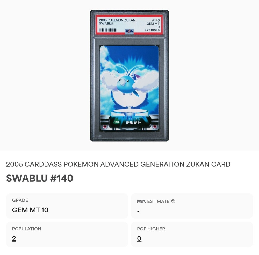 PSA 10 GEM MINT Swablu #140 Carddass Zukan Advanced Gen. Bandai Pokémon POP 2. POP 2 as of 11/27/24. Please reach out with any questions and we would be happy to assist you. Returns are not accepted. You will receive the exact graded card pictured. Please see high resolution scans. Purchase of this item signifies agreement that Grade, Actual Condition and expected standards all match. Please see PSA website for more info. Shipping info: All graded cards are shipped securely in bubble mailer and cardboard box; regardless of price. Please reach out with any concerns before contacting ebay and we'd be happy to assist you. Please note that due to inventory accuracy, purchases will not be cancelled before or after shipping. Please reach out with any questions before purchase and we would be happy to assist you.