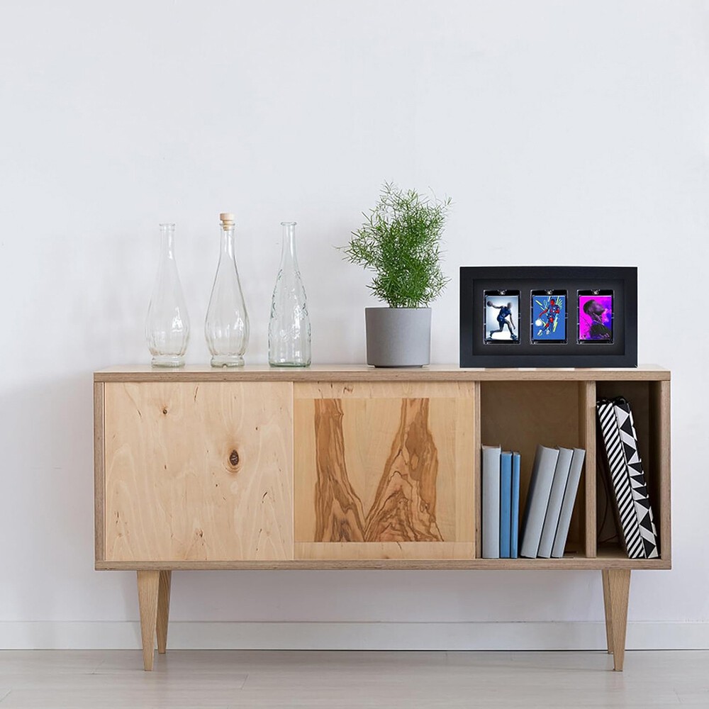 Product Description Features: 【 Designed for PSA Graded Cards/Magnetic Card sleeve(TWO options) 】 An awesome way to show off your collection. Instead of putting your cards in a drawer or a box, this frame is a cool way to display your favorite PSA graded Baseball, Basketball, Hockey, Football, Pokemon, MTG, Yugioh Cards and more. 【 The Best Display Angle 】 The card slot is cut from soft and elastic EVA, protecting your precious card, while keeping the cards at the best display angle. Besides, the card will not fall off when installing or changing cards. 【 Creative Display Frame Structure 】 This trading card display frame works like a picture frame. It come in one piece. No need to find any screws or tools to assemble. Simply remove the back panel, place your cards in the slot, reassemble and hang like a picture frame. That's so easy! Specification : Material : MDF Frame +EVA Foam + Acrylic Size:340*200*30mm Package included: 1 x Card Display Frame