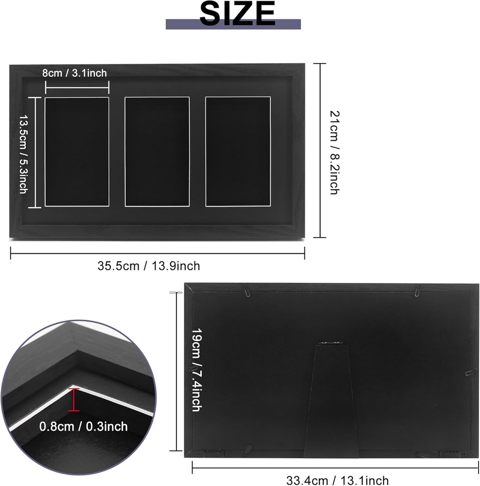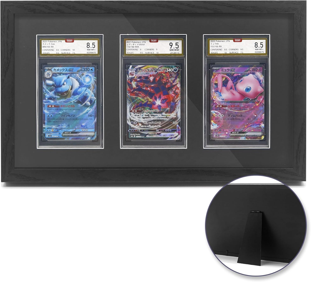 Engineered Wood 【Designed for PSA Graded Cards】An awesome way to show off your collection. Instead of putting your cards in a drawer or a box, this frame is a cool way to display your favorite PSA graded Baseball, Basketball, Hockey, Football, Pokemon, MTG, Yugioh Cards and more. Please note that this is ONLY fit for PSA graded cards. CARDS NOT INCLUDED. 【Dimensions】The frame Overall size is 8.2"x13.9" x0.8" and the interior depth is 0.3 inches. The glass open window for each slot is 3.1x5.3". Can hold 3 pieces PSA Graded cards. 【Premium Material】Our trading card display frame is made of heavy-duty engineered wood with black finish with shiny texture. Real glass not plexiglass, it’s super clean, beautiful and elegant, matches any room or desk. 【Wall & Tabletop Display】With stand bracket, it can be displayed on desktop and table top, for your home and office. Always show your loved cards. It can also be mounted on the wall horizontally with two hooks. 【Perfect Gift choice】 This card display case can display our beloved graded cards. At the same time, it is also an exquisite gift for family, children, friends, classmates, colleagues, club fans and sports fans who love collection cards. Product Description More Shadow Box Choices from FramePro Add to Cart Add to Cart Add to Cart Add to Cart Add to Cart Add to Cart Add to Cart Customer Reviews 3.4 out of 5 stars 21 4.4 out of 5 stars 437 4.6 out of 5 stars 897 4.4 out of 5 stars 33 4.7 out of 5 stars 700 4.7 out of 5 stars 700 3.8 out of 5 stars 11 Price $19.99 $ 19 . 99 $65.99 $ 65 . 99 $33.24 $ 33 . 24 $35.14 $ 35 . 14 $25.99 $ 25 . 99 $22.55 $ 22 . 55 $39.99 $ 39 . 99 Colors Black Black/White/Red/Wood Black/White/Wood Black/White/Natural Black/White/Wood Black/White Carbonized Black Sizes 5.3x3.1 11x14/12x16/16x20/18x24 11x14/13x16/16x20/18x24 11x14/13x16/16x20 6x8/8x8/8x10/11x14/12x16 8x10/11x14/12x16 11x16 Material Engineered Wood Engineered Wood/Real Wood Engineered Wood/Real Wood Engineered Wood Engineered Wood Engineered Wood Real Wood Glass Real Glass Plexiglass Real Glass/Plexiglass Plexiglass Real Glass Real Glass Real Glass Interior Depth 0.3" 2" 1.5" 1.5" 1" 1" 2.6"