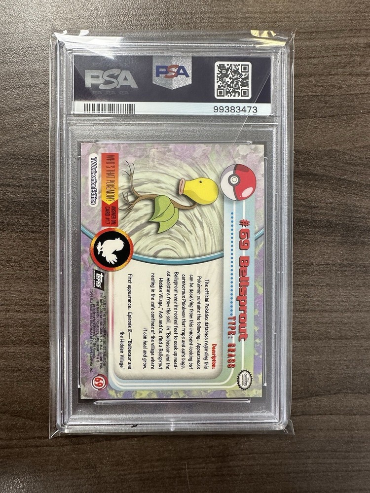 This is a Bellsprout #69 Foil from the 1999 Pokémon set Topps T.V. Animation. It has been professionally graded by PSA in a Near Mint- Mint 8. The certification number is 99383473.
