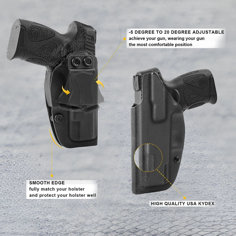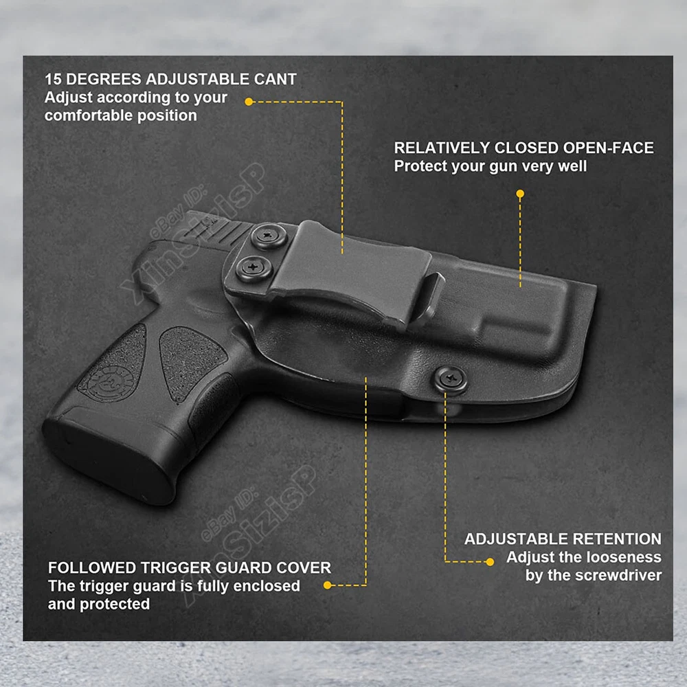 Gauge/Caliber: 9 mm Luger, .40 S&W Carry Position: 1 o'Clock, 2 o'Clock, 3 o'Clock, 4 o'Clock, 5 o'Clock Attachment Type: Belt, Clip Features: Adjustable Cant, Lightweight, Quick-Drying, Ultralight, Water Resistant, Weather Resistant, With Clip Material: Kydex UPC: Does Not Apply Manufacturer Warranty: 1 Year Country/Region of Manufacture: China For Gun Type: Pistol Type: Concealment Holster Sport/Activity: Shooting Brand: TEGE Carry Location: Belly Band, Inside Waistband (IWB) For Gun Make: Taurus Level: Level 2 MPN: Does Not Apply Custom Bundle: No gtin13: Does Not Apply Color: Black Handedness: Right