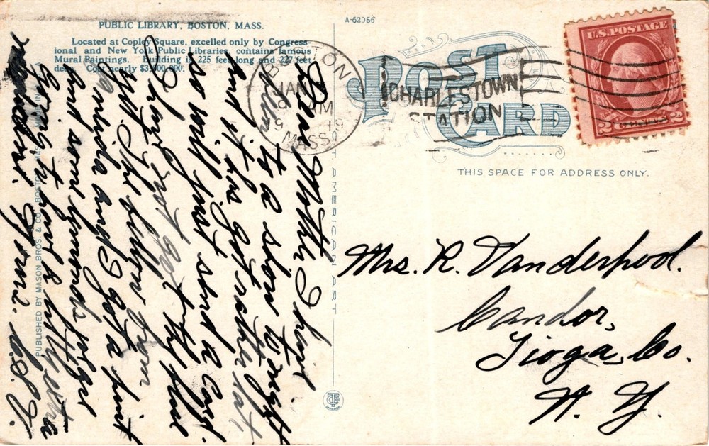 MAKE AN OFFER. THE MORE YOU BUY THE BETTER DEAL I WILL ACCEPT The postcard features an image of the Public Library in Boston, Massachusetts, located at Copley Square. The library is described as being only surpassed by the Congressional and New York Public Libraries and contains famous Mural Paintings. The building is 225 feet long and 227 feet deep, with construction costs nearing $300,000.