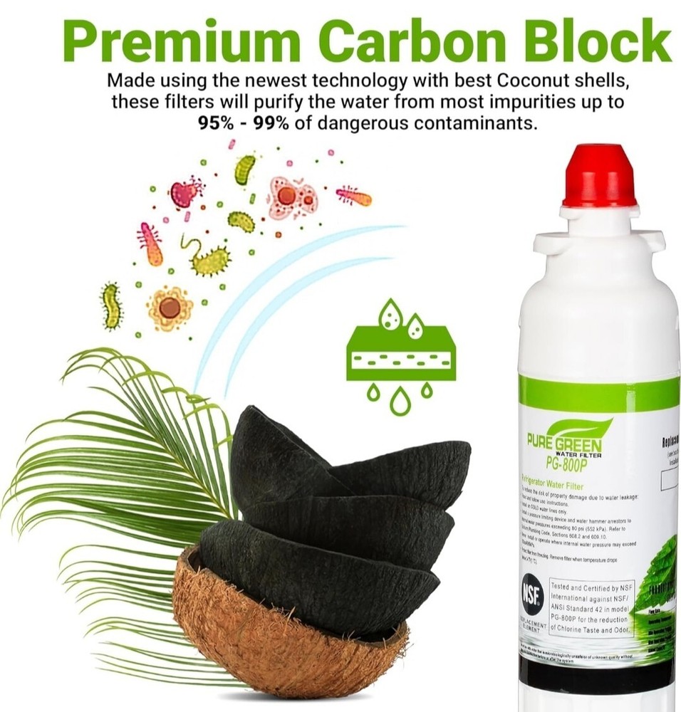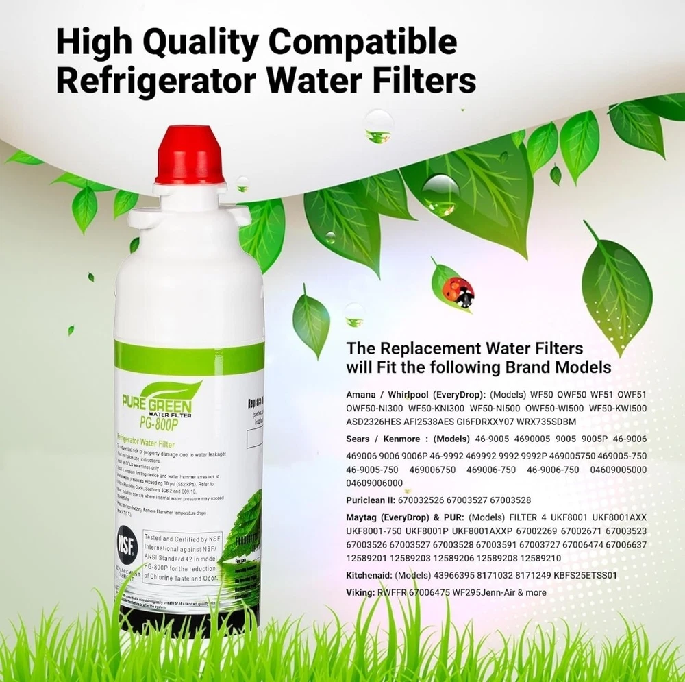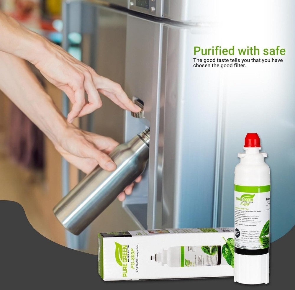 PURE GREEN WATER FILTE This Pure Green refrigerator water filter replacement for LG ADQ73613401, despite its affordable price, offers the best - a mix of prior filtration performance and important certifications from the well-known regulatory body in the industry – NSF 42 and NSF 372 certificates. [Advance filtration process] If you have been looking for a way to reduce harmful impurities from your drinking water, the solution is here. This replacement for LG LT800P fridge water filter effectively filters off impurities from your water. While these chlorine, taste, odor, and other suspended particles tested by the third-party laboratory are reduced, every beneficial mineral in your water is kept. Replacement for filter models: LG LT800P, LT800P/PC/PCS, ADQ73613401, ADQ736134, ADQ73613402, ADQ75795104, Kenmore 9490, 46-9490, 469490 . LG is a registered trademark of LG CORP. LG is used for reference purposes only. Compatible with: LSXS26326S, LSXS26366S, LMXC23746D, LMXC23746S, LMXS30746S, LMXS30756S, LMXS30776D, LMXS30776S, LMXS30786S, LNXC23726S, LNXC23766D, LNXS30866D, LPXS30866D, LPXS30866S, LPXS30876D, LSC22991ST, LSXC22326S, LSXC22336S, LSXC22386D, LSXC22386S, LSXC22426S, LSXC22486S, LSXS22423B, LSXS22423S, LSXS22423W, LSXS26326B, LSXS26326W, LSXS26336V, LSXS26366D, LSXS26386D, LSXS26386S, LSXS26466D, LSXS26466S.