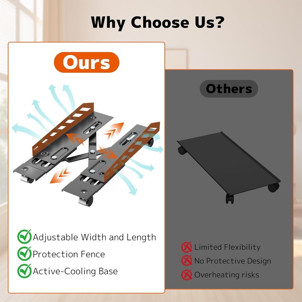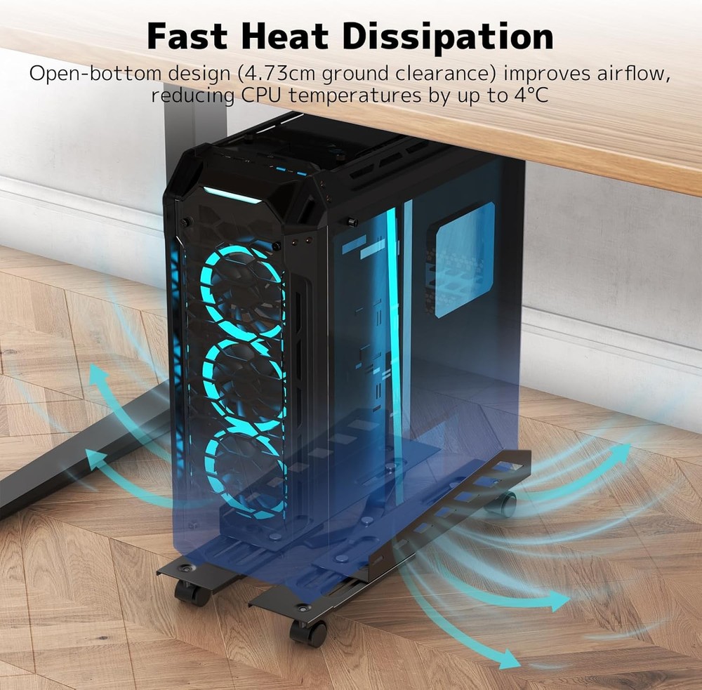 Free eBay listing template designed by dewiso.com PUTORSEN Computer Tower Stand - Under Desk PC Stand for Floor with Rolling Caster Wheels, Adjustable CPU Tower Holder Fits Most PC Tower FREE AND FAST SHIPPING! About this item UNIVERSAL ADJUSTABLE FIT - Our PC stand's wide adjustment range (6.29”-11.81” width, 15.75”-20.08” length) securely holds most desktop computer case, offering a snug fit that others can't match. Note: Please confirm your case dimensions before purchase for the ideal fit. HEAVY-DUTY CONSTRUCTION - Built to last with a robust, high-quality steel frame. This computer tower stand boasts an impressive 55 lb load capacity, offering unwavering stability and reliable protection for your valuable equipment. EFFORTLESS LOCKING MOBILITY - Glide your computer anywhere with four 360° smooth-rolling wheels. Two lockable casters allow you to instantly secure the stand in place, providing stability during use and easy mobility for cleaning or accessing cables behind your tower. It tucks neatly under any desk when not in use. GUARDRAILS DESIGN - Protective side railings prevent your valuable PC chassis from tipping or falling, ensuring ultimate safety and stability on any surface, including carpet. SUPERIOR ACTIVE COOLING - Prevent overheating and extend your hardware's life! The perforated bottom panel, side rails and elevated design create optimal airflow, ensuring superior ventilation and faster heat dissipation compared to leaving your tower on the floor. Product We offer a 30-Day Return Policy on items which you are not completely satisfied with. You have the option for a full-refund or an exchange of the item. No returns are available on items shipped outside of the US . Shipping We offer Free Shipping to the US and ship within 2 business days of payment, usually sooner. We use UPS express shipping. That's why your products are usually delivered within 3 days . Contact We try our very best to make sure every customer is completely satisfied. If there's a problem , message us! We're happy to help. 24/7 live chat available.