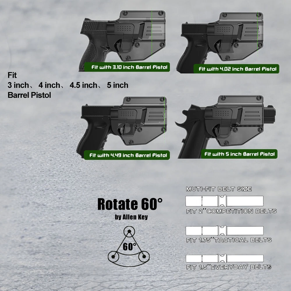 Mega-fit Holster / Versatile Holster / Universal Holster, Fits Most Popular Full Size and Compact Pistols, Fits Pistols with Red Dot, Fits Pistols with High Front Sight I tem D escription : Holster fit Beretta Beretta 92FS 9mm Luger Beretta 92X Performance 9mm Luger Beretta 92 9mm Luger Beretta 92X Centurion 9mm Luger Beretta 92S Full Size 9mm Luger Beretta 92G Elite LTT 9mm Luger Beretta M9 9mm Luger Beretta M9A1 9mm Luger Beretta M9A3 (without laser) 9mm Luger Beretta M9A4 9mm Luger Beretta PX4 Storm Full Size 9mm Luger Beretta PX4 Storm Compact 9mm Luger Beretta PX4 Storm Subcompact 9mm Luger Beretta APX Full Size 9mm Luger Beretta APX Centurion 9mm Luger Beretta APX Compact 9mm Luger Beretta APX Carry 9mm Luger Beretta APX A1 Carry 9mm Luger Beretta APX A1 Full Size 9mm Luger Beretta APX A1 Compact 9mm Luger .40 S&W Beretta 96A1 .40 S&W Beretta 96 Brigadier FS .40 S&W Beretta PX4 Storm Full Size .40 S&W Beretta PX4 Storm Compact .40 S&W Beretta Zigana C .40 S&W .45 ACP Beretta PX4 Storm Full Size .45 ACP Beretta PX4 Storm Compact .45 ACP Attention: While you have the holster, please follow these three steps to adjust its retention for a customized fit, as shown in the listing picture. Proper adjustment ensures your weapon is secure. Without it, the holster may not fit any firearm correctly. 1) After adjust the retention , Weapon Compatibility - Outside Waistband Tactical H olster Fit Holster perfect work with suppressor sights, and fit all the capacity 9mm,10mm, .40 cal, .45 cal a n d 22LR for the gun. Compatible-Beretta Fits Beretta 92, 92X Centurion, 92S Full Size . 92G ELITE LTT , 92A1, 92FS, PX4, PX4 STORM, APX, M9A1, M9A3 without laser, APX Centurion 9mm, APX Compact 9mm , APX A1, APX A1 compact , M9A1 Compatible-Bersa Fits Bersa Thunder 9 Pro XT Compatible-BRG Fits BRG USA BRG9 Elite 9mm Compatible-Browning Fits Hi-Power, Hi-Power 640, Hi-Power 3D, Browning Mark III Compatible-Canik Fits TP9 Elite Combat, TP9 SFX, TP9 SF,TP9 Elite-S, TP9SA Compatible-Caracal Fits Caracal EF, Caracal F, Caracal F Gen II Compatible-Colt Fits Colt 1911-3'', 1911-4'', 1911-5'', M1911 A1, M1911, Colt 1911 .45, Colt 1911 9mm Compatible-CYMA Fits CYMA CM127 Compatible-CZ Fits CZ P07, P09, 75 SP-01 Shadow, Shadow 2, P-10C, P-10 F, 75, 75B, 85 Compatible-FN Fits FNX-45, FN-509 Compatible-Girsan Fits Girsan MC28, Regard MC 9mm, MC28 SA 9mm, MC 14T, MC P35 PI LW, MC28 SA, Regard MC, 1911 MC Compatible-Glock Fits Glock 17 Gen(1,2, 3, 4, 5), Glock 19 Gen(1,2, 3, 4, 5), Glock 19X, Glock 21, 22 Gen(1,2, 3, 4, 5), 23 Gen(1,2, 3, 4, 5), 24, 26, 27, 30, 31, 32, 33, 34, 35, 36, 41, 42, 43, 43X, 43X, MOS, 44, 45, 47, 47 mos, 48. Compatible-Heckler & Koch Fits H&K USP and H&K USP Compact, SFP9,VP9 Compatible-Hi-Point Fits Hi-Point C9 Compatible-HS Fits HS-9 Compatible-ISSC Fits M22 Gen2 Compatible-IWI Fits Masada 9mm, Jericho 941 9mm Compatible-Jericho Fits Jericho 941 RS Compatible-Kahr Fits CW45 Compatible-Norinco Fits Norinco NP22 Compatible- Palmetto State Armory Fits PSA Dagger Compact 9mm, PSA Dagger Full Size S 9mm, PSA Dagger Full Size SX 9mm, PSA Dagger Micro 9mm, PSA 5.7 Rock Compatible-Para ordnance Fits Para ordnance P12-45 Compatible-PREXER Fits Wist 94 Compatible-Radom Fits VIS 100 Compatible-Rock Island Armory Fits Baby Rock 380, BBR 3.10 45ACP, BBR Standard 380ACP, M200, M206, 1911 , SA 1911 Compatible-Ruger Fits Ruger MAX-9, Security-9, Security 9 Compact/ Pro/ Standard , Security 380, Ruger-5.7, Ruger American, SR1911, SR22, RSR9, SR9C, SR40, SR45, PRESCOTT 57, LC9 , Compatible- SCCY Fits CPX-1 (Gen 1 2 3), CPX-2 (Gen 1 2 3) , CPX-3 (Gen 1 2 3) , DVG-1, CPX-1RD / CPX-1RD Compatible- Sarsilmaz Fits AR-24 , AR-24K, B6, B6C, B6C7.65, B6C-LR, B6C-S, CM9, K-12 Sport, K-12 Sport X, K11, K2 45, K2 45C, Kilinc 2000 Light, Kilinc 2000 Mega, P8 L, P8S, SAR 9, SAR 9 C, SAR 9 METE Compatible-Shadow Systems Fits CR920 Elite, DR920, DR920 FS, DR920P, MR920 Compatible-Sig Sauer Fits Sig Sauer P365, P365 BB , P365X / XL/ SAS/ X Macro, P220, P225, P226, P228, P238, Sig Pro 2022 (Germany or USA version), SP2022 SAR, P938, P320, P229, P250, P320 Compact, P320 with Lima Laser Compatible-Smith & Wesson Fits Smith & Wesson M&P 9MM, M&P M2.0 9MM, M&P 40, M&P 45 ACP, M&P 40, M&P .40 C, M&P .45, M&P 9 M2.0, M&P Shield 9mm, 40, 45, M&P Compact 9, 40, SW9, SW9V, SD9 VE, SD40 VE, SD40, M&P 40 M2.0, 380 SHIELD EZ , 9 SHIELD EZ , M&P9, 9 SHIELD ,CSX, S&W 1911 Compatible-Springfield Fits Springfield XD-9, XD-40, XD-45, XD-S, XD-S .45 ACP, XDM-9, XDM-40, XDM-45 ACP, XDE-9, HELLCAT, HELLCAT PRO, Hellcat OSP / RDP 9mm , XDS-45, XDS-9, XDM , XDM elite 10mm , 1911 SA , 1911 Compatible-Steyr Fits Steyr Arms C9-A1, Arms C9-A2, Arms C9-A2 MF Compatible-Stoeger Fits STR-9 Compatible-Tara Fits TM9 Compatible-Taurus Fits Taurus Millennium, Taurus 100, Taurus 92, PT111 G2, G2C, G3, PT24/7, GX4, PT111, PT132, PT138, PT140, PT145, PT745, PT938, T800 series and Pro version, PT809, PT709, PT24/7, PT24/7-OSS, PT809C, PT840C, G3, TH9, Taurus 1911, Taurus PT 92 AF, TX22 compact, TX22 22LR Compatible- Tisas Zigana Fits PX-9, Tisas zig m1911 duty .45, Tisas M1911 .45 Compatible-Walther Fits Walther P99 QA, PPQ(M1 M2 M3), P88 9mm, PPQ Compatible-Zastava Fits EZ9, EZ40 ( Without embedded chassis, and no flashlight style ) 2) Holster with paddle - Push side buttons to achieve the fast opening and closing, unique design allows for belt carrying or vest carrying, perfectly used by duty holsters, uniformed law enforcement officers, security personnel, military personnel, private persons, and shooting sports holsters. And it fits closer to the body which can achieve better concealment under clothes. 3) Secure Level II Retention - Auto-locking system restrain pistol in OWB holster to ensure ultimate safety, activate the release by pressing the button with the index finger to achieve gun access . 4) Adjustable Carry Angle - Easily set Holster 360 degrees to your desire position with Allen key, compatible belt width up to 2 inches . 5) Tough, Durable Materia