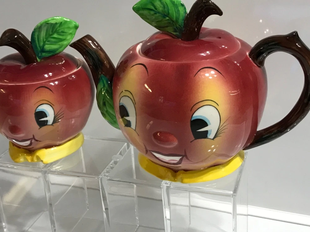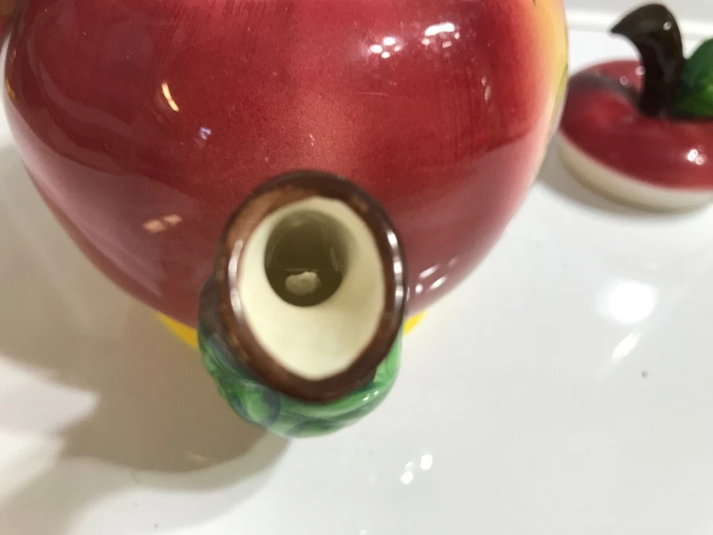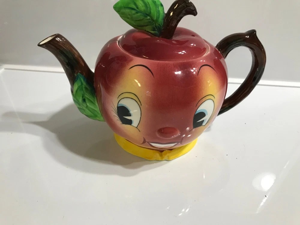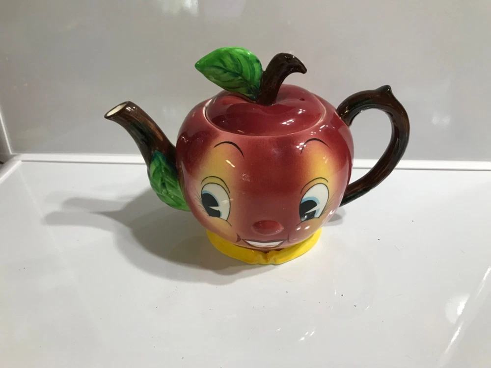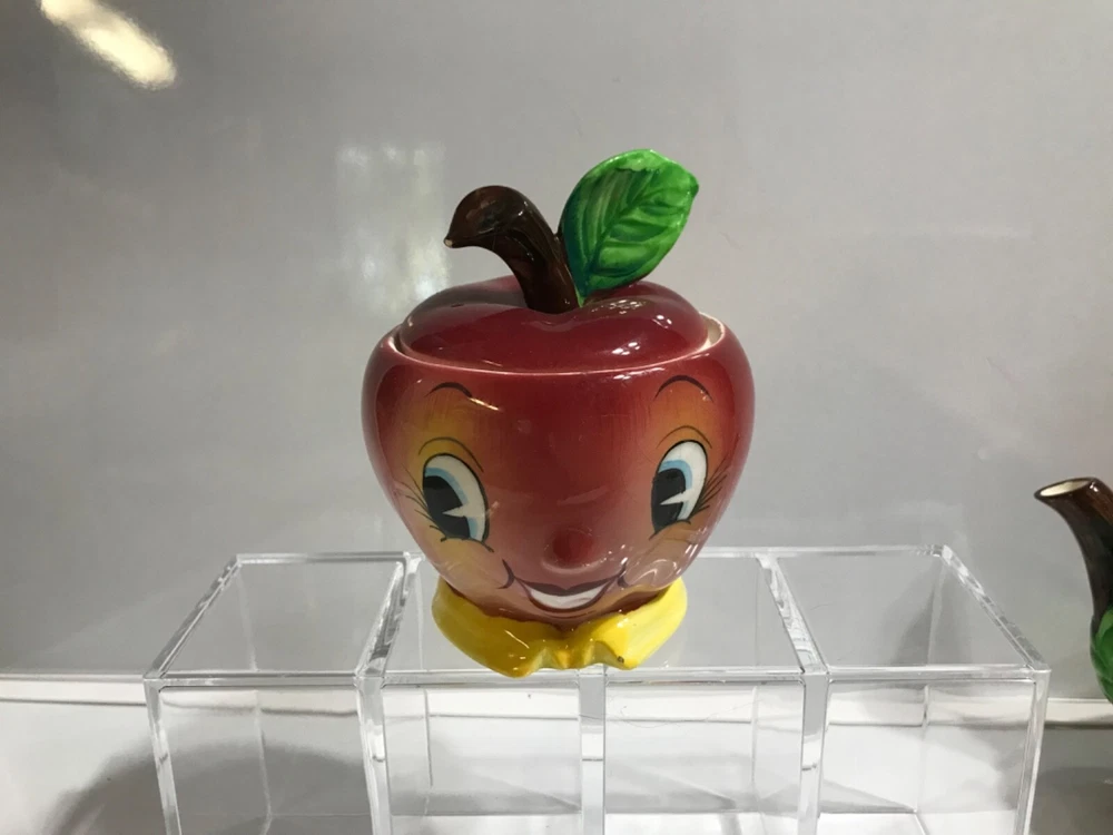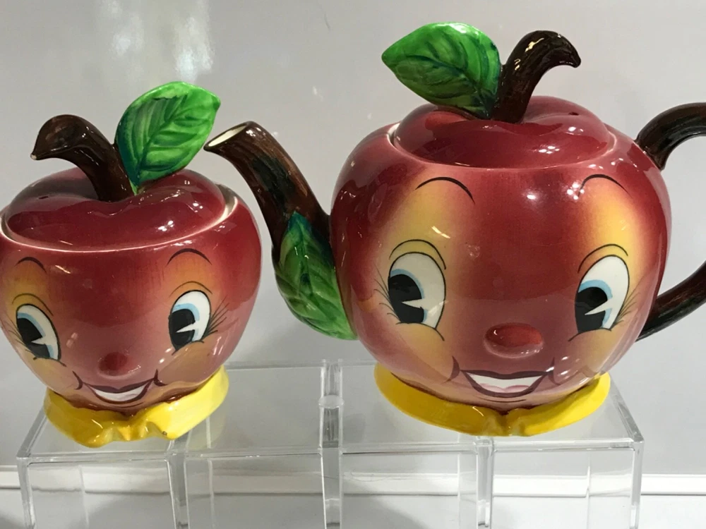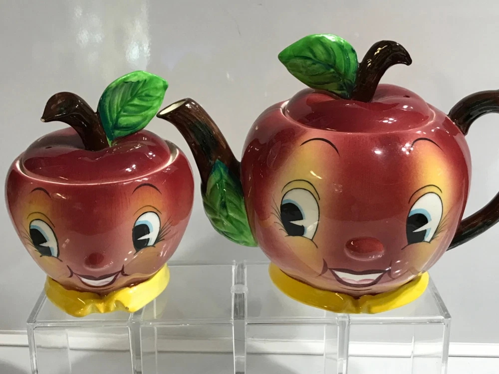 Cute smiling teapot and sugar bowl made by Py Miyao in Japan in the fifties.Teapot is excellent. No chips, cracks or repairs.The sugar bowl has 3 tiny glaze chips on yellow collar and a few tiny ones inside rim of apple.