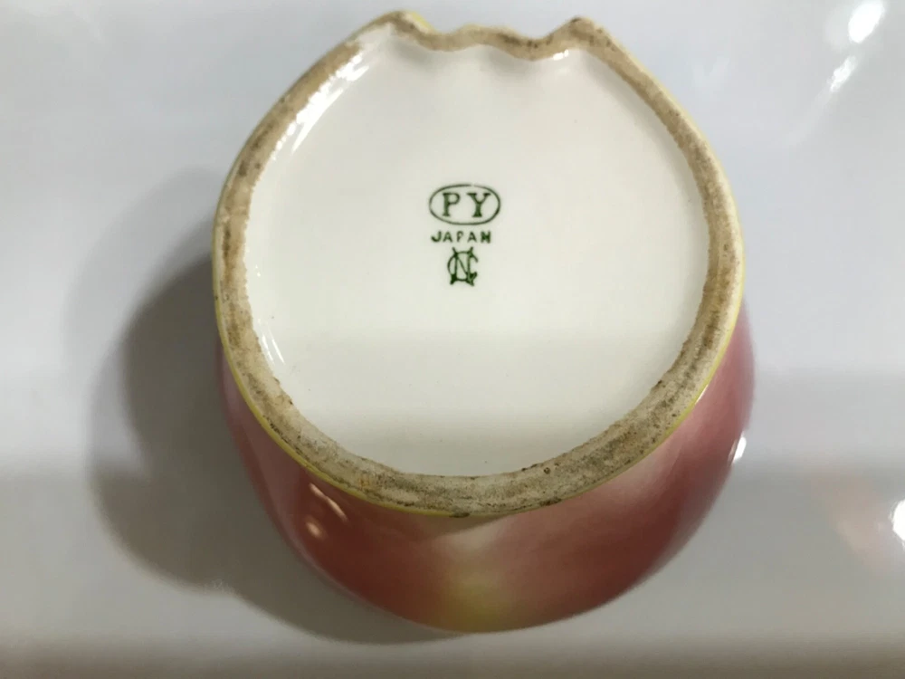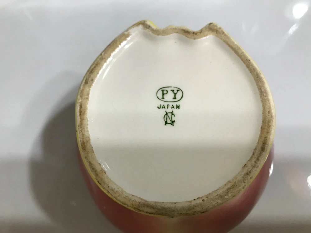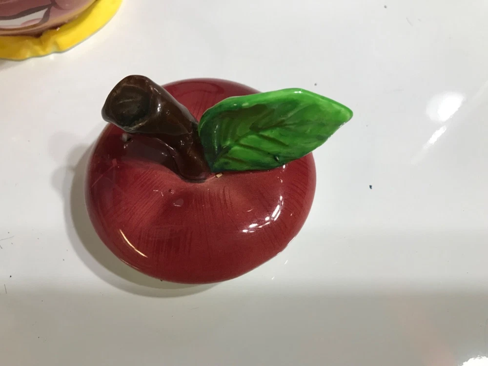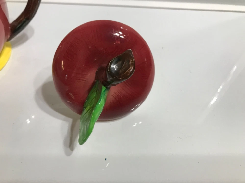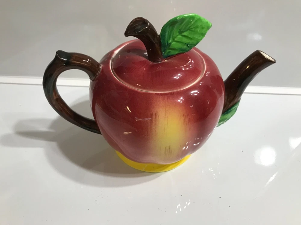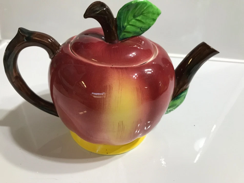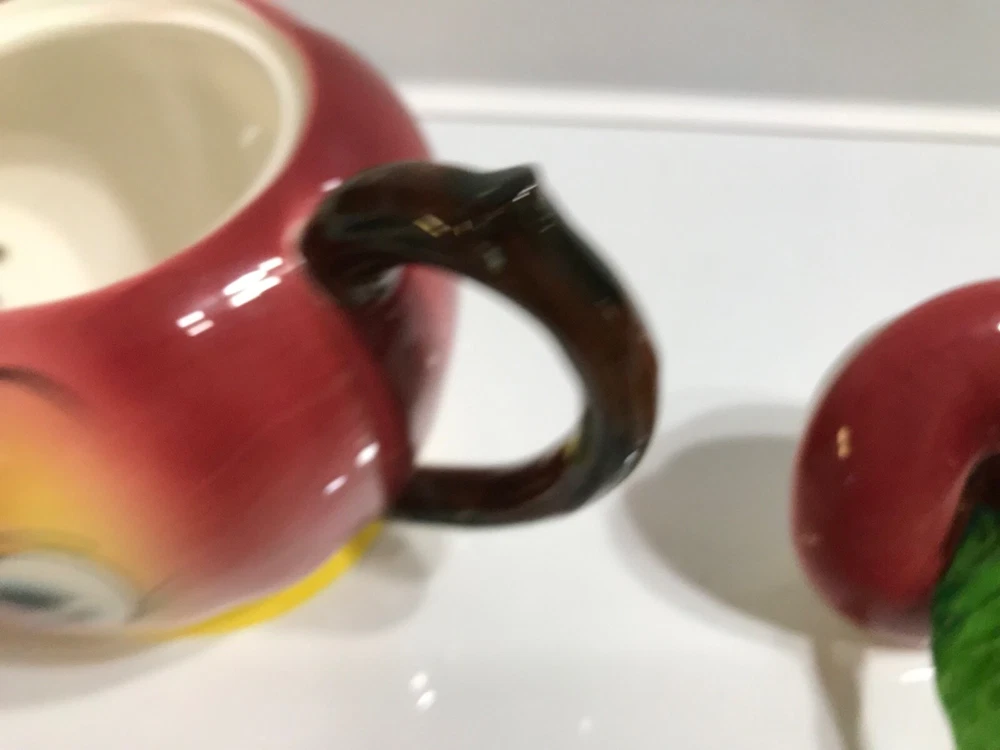 Cute smiling teapot and sugar bowl made by Py Miyao in Japan in the fifties.Teapot is excellent. No chips, cracks or repairs.The sugar bowl has 3 tiny glaze chips on yellow collar and a few tiny ones inside rim of apple.