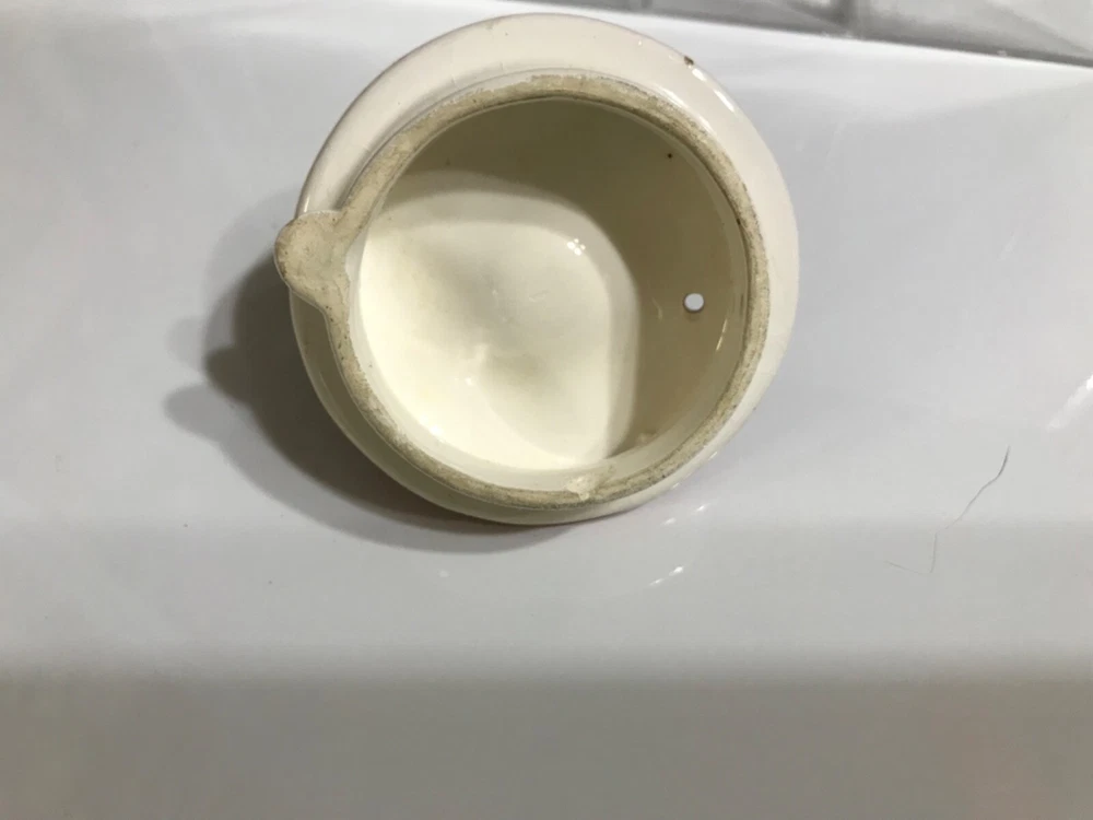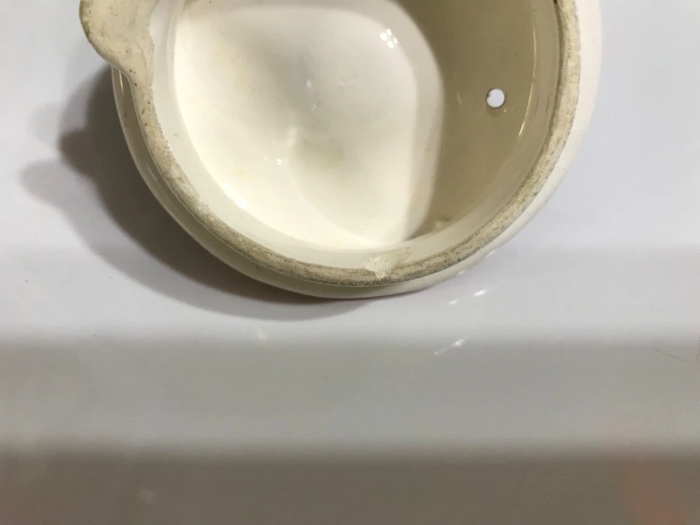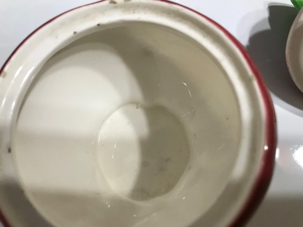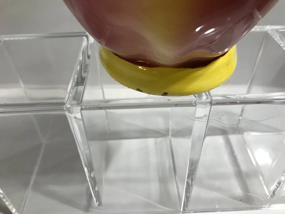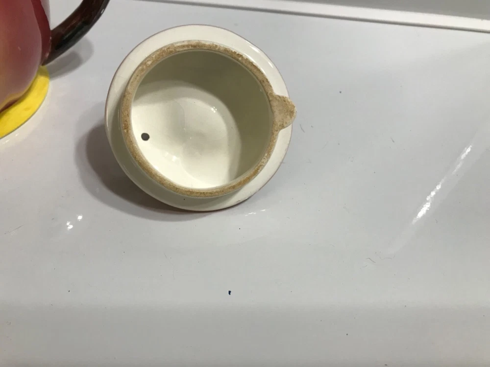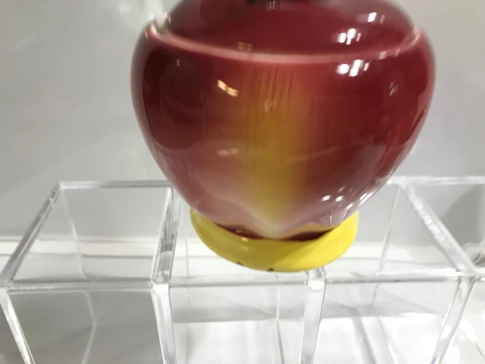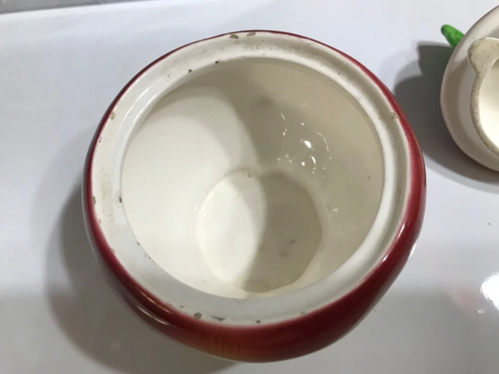 Cute smiling teapot and sugar bowl made by Py Miyao in Japan in the fifties.Teapot is excellent. No chips, cracks or repairs.The sugar bowl has 3 tiny glaze chips on yellow collar and a few tiny ones inside rim of apple.
