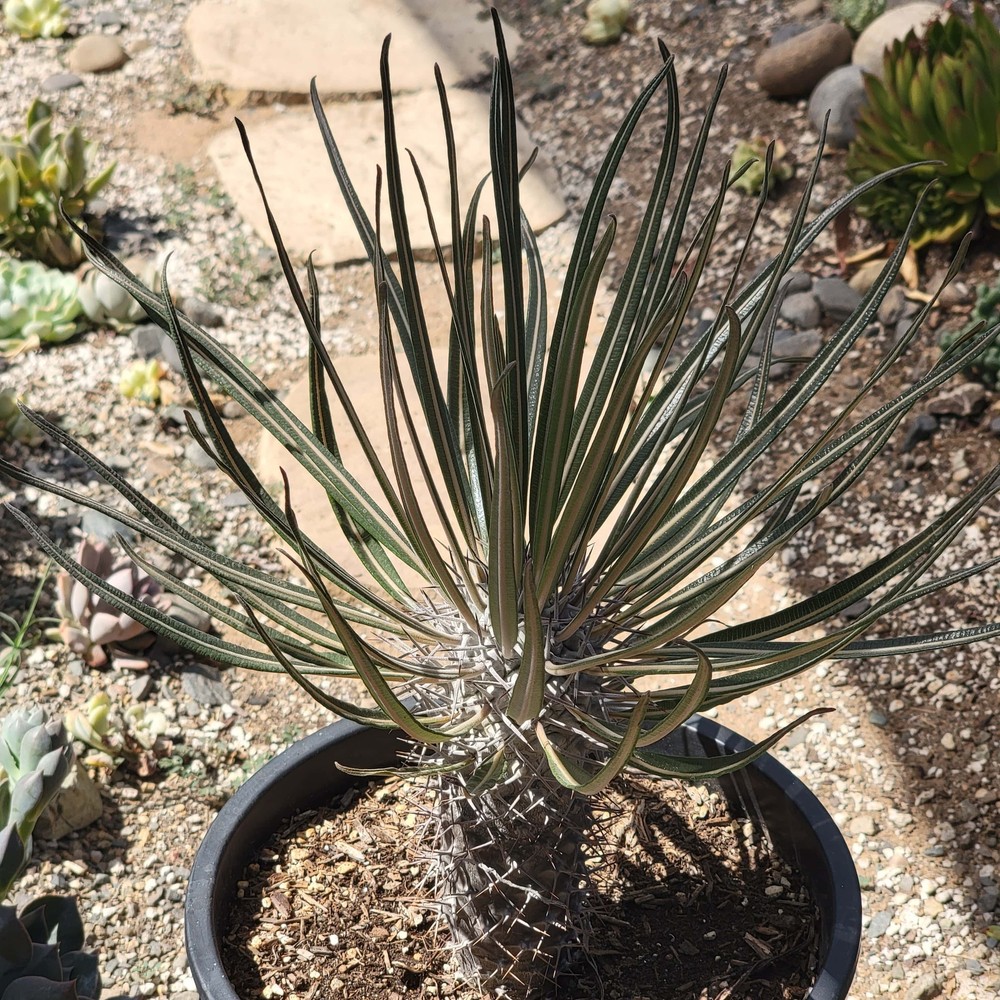 Pachypodium gaeyi is a highly decorative, 4-7 (-8) m tall tree with bottle-shaped stems and metallic grey branches that are thick and succulent. It closely resembles cereiform cacti, with cylindrical stems that are highly succulent and armed with sharp spines. This species, often mistaken for Pachypodium lamerei, can be easily distinguished by its thinner leaves, which have a prominent midrib of a different color, and by the presence of hairs on its young branches and leaves. P. geayi, one of the largest of the Madagascar species, is known for its decorative qualities and is often considered superior to Pachypodium lamerei. The Pachycaule trunk of the Pachypodium gaeyi 'Madagascar Palm' is typically unbranched, growing above ground in a columnar shape. It can reach heights of 3-6 meters and has a diameter of 15-30 cm at the base, gradually thickening to 40-80 cm. The young growth is covered in silvery grey felt, while older parts have a papery bark ranging from greyish white to yellowish white. Interestingly, the trunk is composed of 91.5% water. Secondary branches are scarce, only appearing near the top of the trunk in a candelabra-like formation, and are usually short and horizontal. The leaves grow in tufts at the tips of branches, are thin and linear-lanceolate in shape, and can reach lengths of up to 40 cm. The upper surface is glossy grey-green or dark green, with a vibrant pink mid-rib. Please Note: Plant will ship bare root with little to no dirt, and you will receive a plant similar to the one in the photo. It is advised to handle this plant with caution and use gloves or tongs as it is covered in spines. Returns & exchanges: Not accepted Please contact us if you have any issues with your order