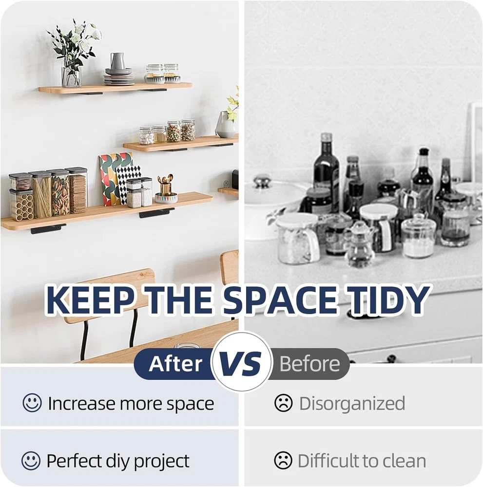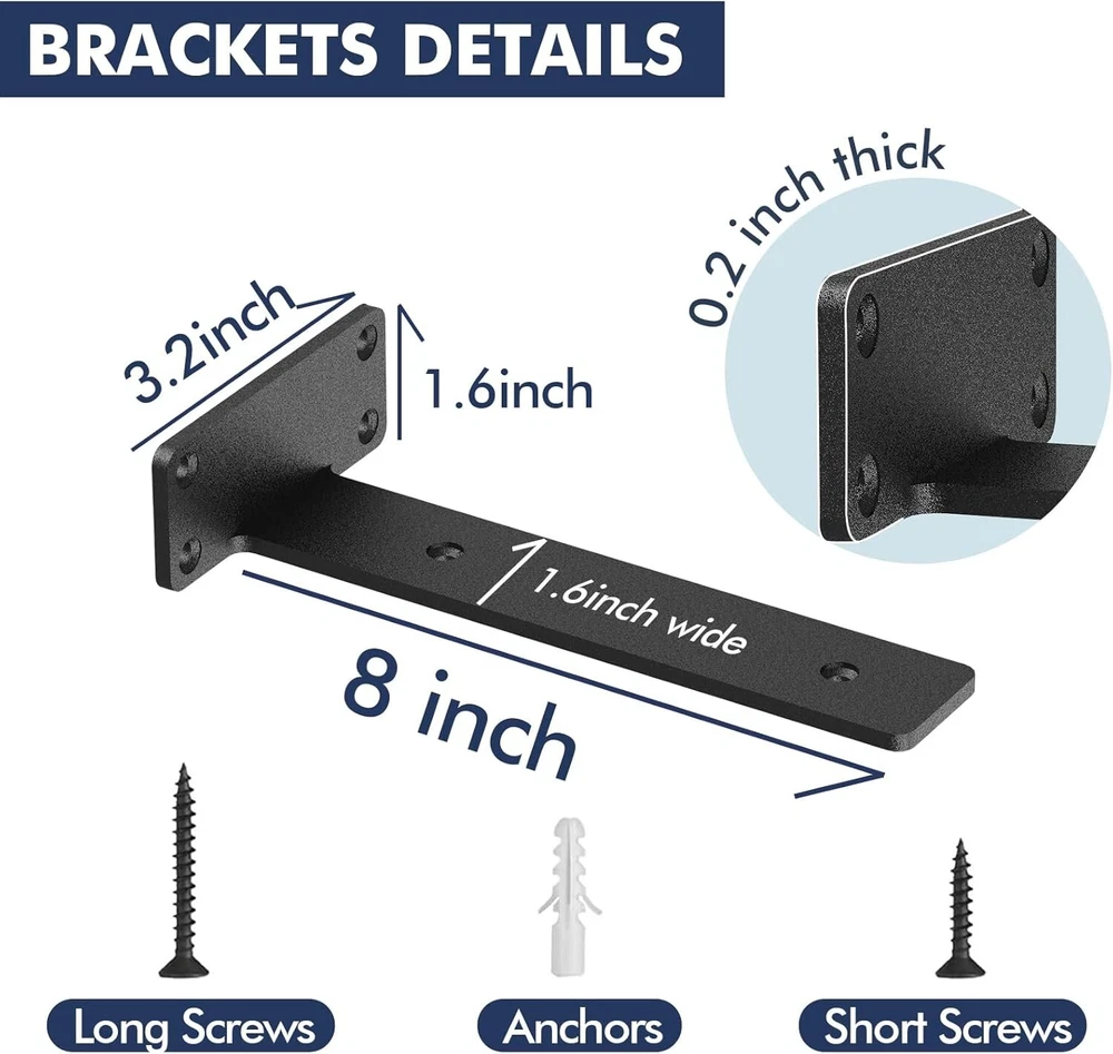 Pack Floating Shelf Brackets, Inch Heavy Duty Industrial Shelf Bracket, Black Metal L Brackets for Shelves Support DIY1/5 Inch Thicked Real Hidden Brackests: These black shelf brackets have no lips and can be truly hidden. The base can be blocked by the plank, creating an amazing floating illusion. Compared with other floating shelf brackets, this bracket is easier to install Heavy Duty: This kind of metal bracket is thicker and heavier, each one has a solid weight and density. Weight capacity of 150 lbs per pair. The surface of the frosted particles has a richer texture, has anti-scratch and anti-rust functions, and can be used for life. Hardware Included: The package includes supports, 32 long screws, 16 short screws and 32 anchors. The countersunk screw hole SATISFACTION GUARANTEEs that the nut stays flush with the bracket without being obtrusive. Perfect DIY Project: Improve item storage efficiency. Make the most of your family space. Including but not to kitchen, bathroom, bedroom, office, warehouse. You can even use it as a cat climbing wall support. Two Installation Methods: Our floating shelf brackets can be installed upwards or downwards, and it is certain that no matter which installation method is chosen, it can be easily done.