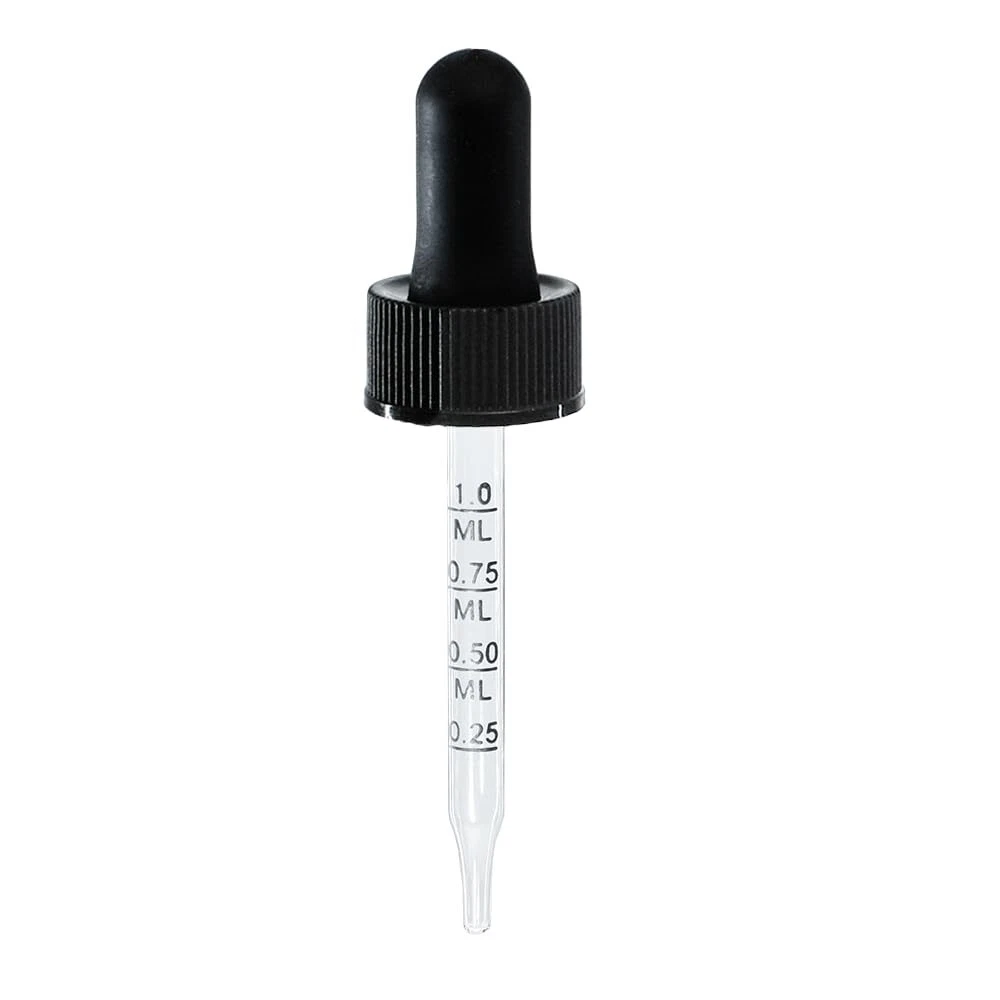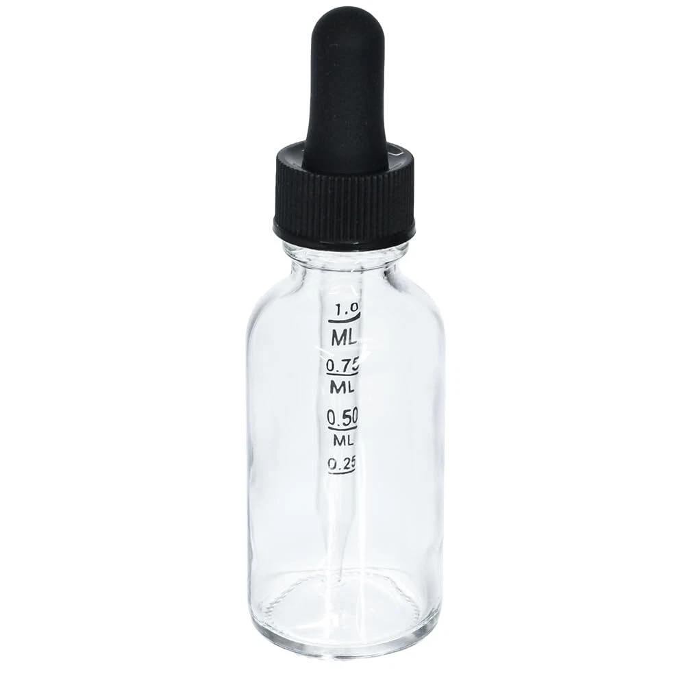 This (Pack of 108) 1 ounce clear Boston round glass bottles with black milliliter graduated glass droppers is the solution to your liquid storage needs. These high-quality clear glass bottles will pristinely display your liquid creations. Dispense your liquids exactly by the milliliter with ease and precision with these graduated black dropper closures. Store and dispense your essential, massage, and beard oils, tinctures, homemade remedies, vape juice, and medicament with ease, or share with family and friends as handmade gifts. These make great kitchen storage for flavorings, oils, spices, extracts, or any liquid ingredients that needs to be dispensed by the milliliter dropper amount. The clear (flint) glass bottle allows you to identify the contents and looks great with any label. (Pack of 108) 1 oz. Clear Boston Round with Black Milliliter Graduated Glass Dropper These high-quality clear glass bottles will pristinely display your liquid creations. Dispense your liquids exactly by the milliliter with ease and precision with these graduated black dropper (20/400) closures. The clear (flint) glass bottle allows you to identify the contents and looks great with any label. Decoratively package handmade gifts of essential, massage, and beard oils, flavorings, extracts, spices, herbal creations, vanilla, and homemade remedies. Proudly packaged in the USA by Americans!